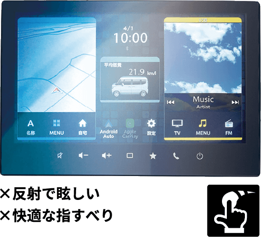 DEFFではスマートフォンの分野でのノウハウを活かし、AGとARを組み合わせる事で車載用保護フィルムとして理想的なバランスを実現しました。