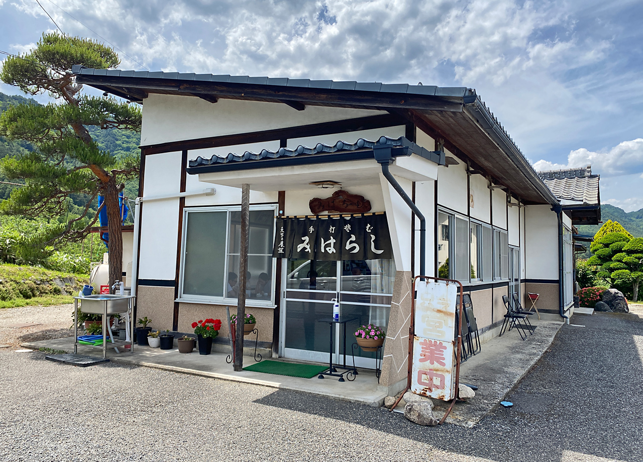 北アルプスの裾野である松川村にあり、「天下の展望」と書かれた暖簾を下げた風情のあるお店『みはらし』は、その名の通り唯一無二の見晴らしを楽しみながら蕎麦を食すことができる蕎麦処です。