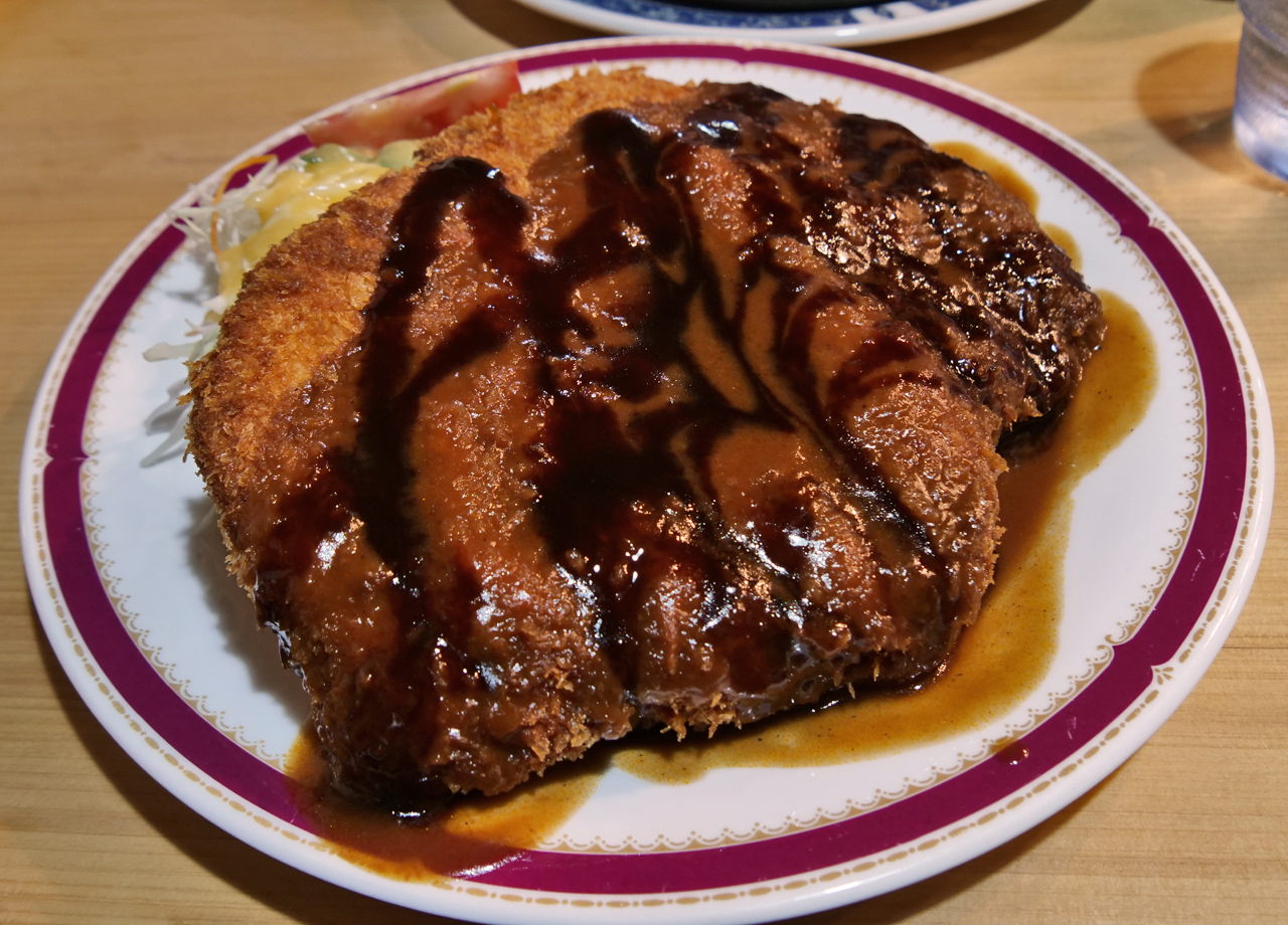 名物はソースのたっぷりかかったチキンカツ。レギュラーサイズでも迫力のボリュームがあり、ランチの時間帯では行列ができるほどの人気店です。