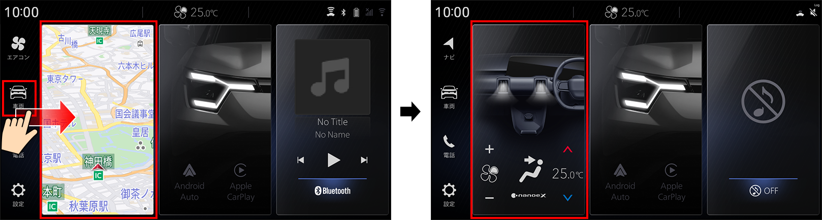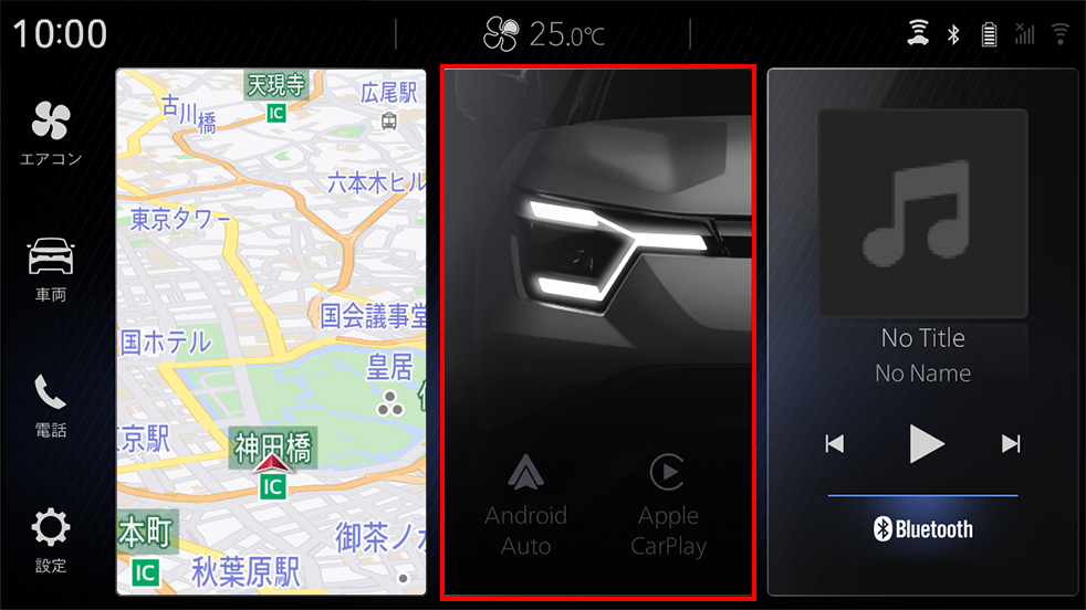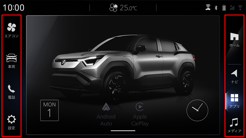 左右のタブでホーム、ナビ、アプリ、メディア、エアコン、車両情報、電話、設定にワンタッチでアクセス可能です。