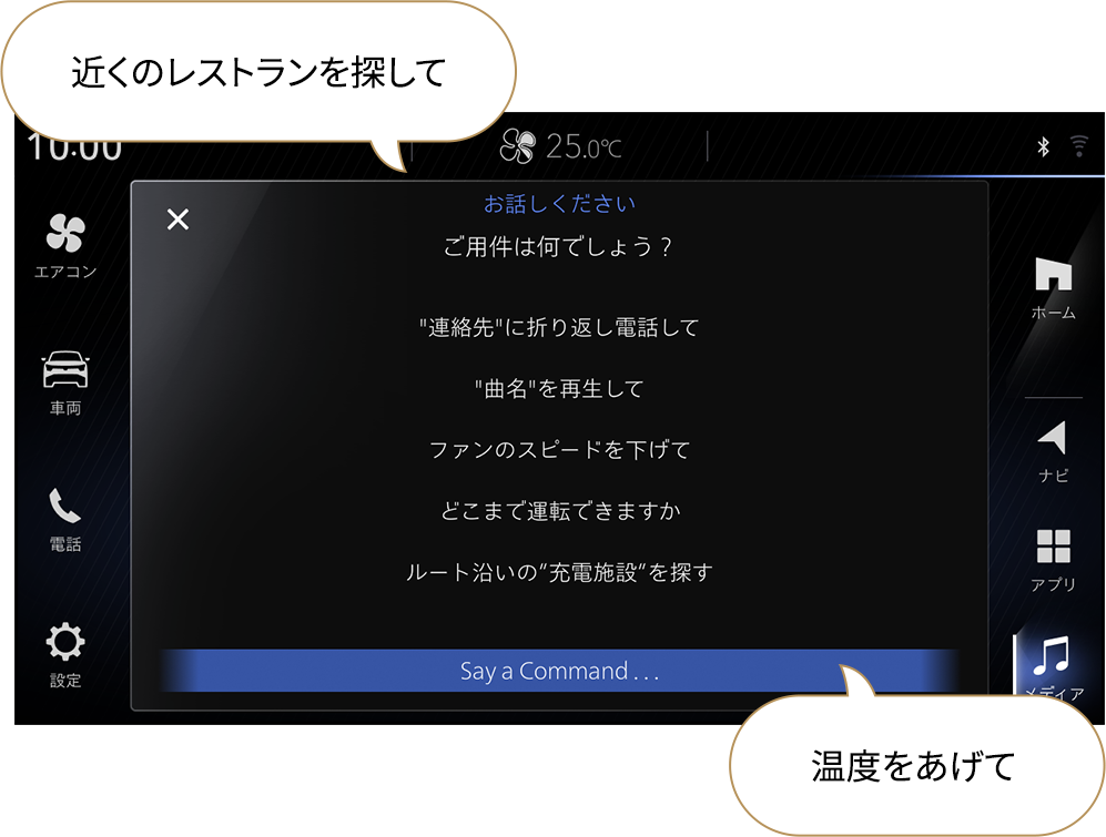 「近くのレストランを探して」 「ルート沿いの充電施設を探して」 |