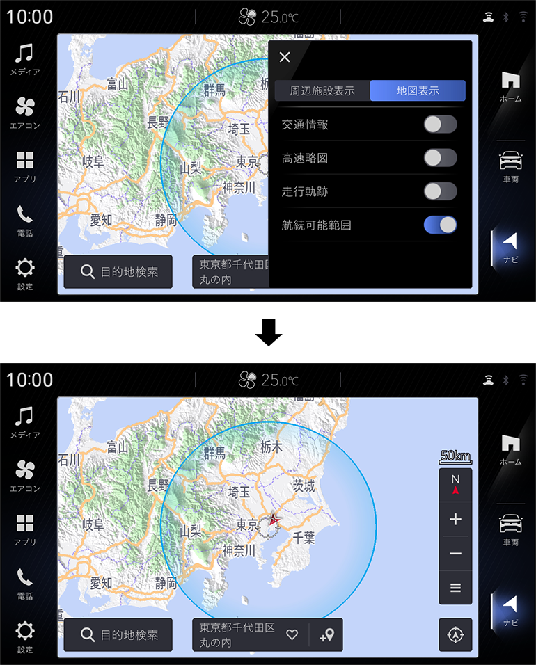 車両の航続可能距離をもとに、一目でわかりやすく地図上に航続可能範囲を表示します。