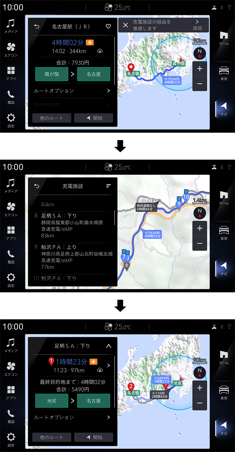 車両の航続可能距離より遠い目的地を設定した場合、充電施設の経由地設定を推奨します。