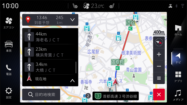 | 目的地検索 | 目的地を施設の名称やジャンル、住所から設定することができます。 また、案内中のルート削除もできます。 |