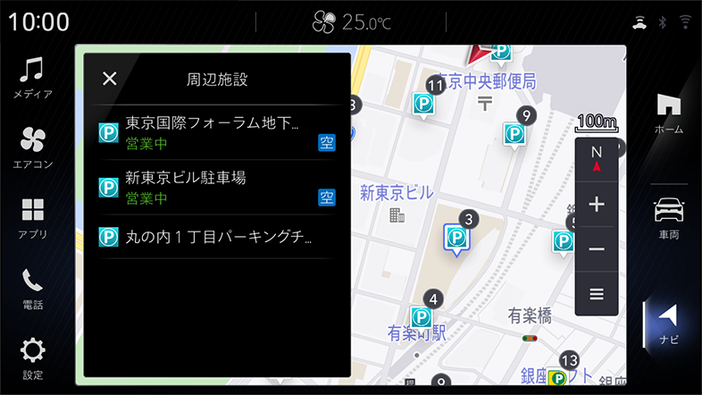 駐車場の満空情報を受信しリアルタイムに表示(特定駐車場のみ)。