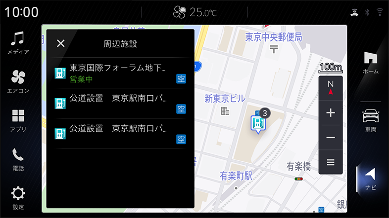 EV充電施設の満空情報を受信しリアルタイムに表示(特定施設のみ)。