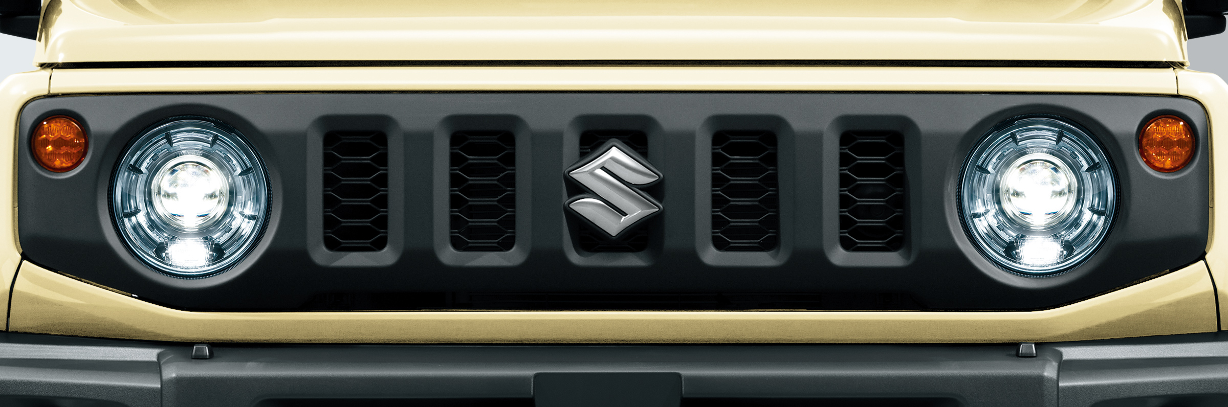 ジムニー シエラらしさの象徴、5スロットグリルと丸型ヘッドランプ&独立ターンランプ。