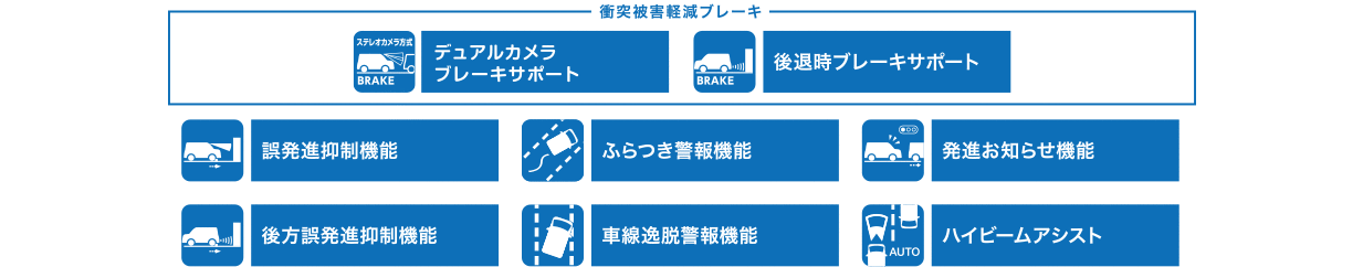 <デュアルカメラブレーキサポートについて>■運転支援を目的としています。■検知性能・制御性能には限界があります。これらの機能に頼った運転はせず、常に安全運転を心がけてください。■状況によっては正常に作動しない場合があります。■対象物、天候状況、道路状況などの条件によっては、衝突を回避または被害を軽減できない場合があります。■ハンドル操作やアクセル操作による回避行動を行なっているときは、作動しない場合があります。■ご注意いただきたい項目がありますので、必ず取扱説明書をお読みください。■詳しくは販売会社にお問い合わせください。<各機能の作動条件>●デュアルカメラブレーキサポート:自車速度約5km/h~約100km/hで走行中、前方の車両や歩行者を検知し、システムが衝突の可能性があると判断した場合。作動したときの自車速度が約5km/h~約50km/h (対象が歩行者の場合は約5km/h~約30km/h )であれば、衝突を回避できる場合があります。周囲の環境や対象物の動きなどによっては、警報のみでブレーキが作動しない場合があります。また、警報と同時に衝突被害軽減ブレーキが作動する場合があります。駐車時の低速でも衝突被害軽減ブレーキが作動。