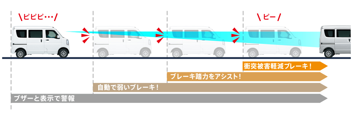 前方の車両や歩行者を検知し、衝突のおそれがあれば音や表示によって警告します。衝突の可能性が高まると自動で弱いブレーキを作動。その間ブレーキペダルを踏むとブレーキ踏力をアシスト。さらに衝突の可能性が高まると、自動で強いブレーキをかけ、衝突の回避または衝突時の被害軽減を図ります。