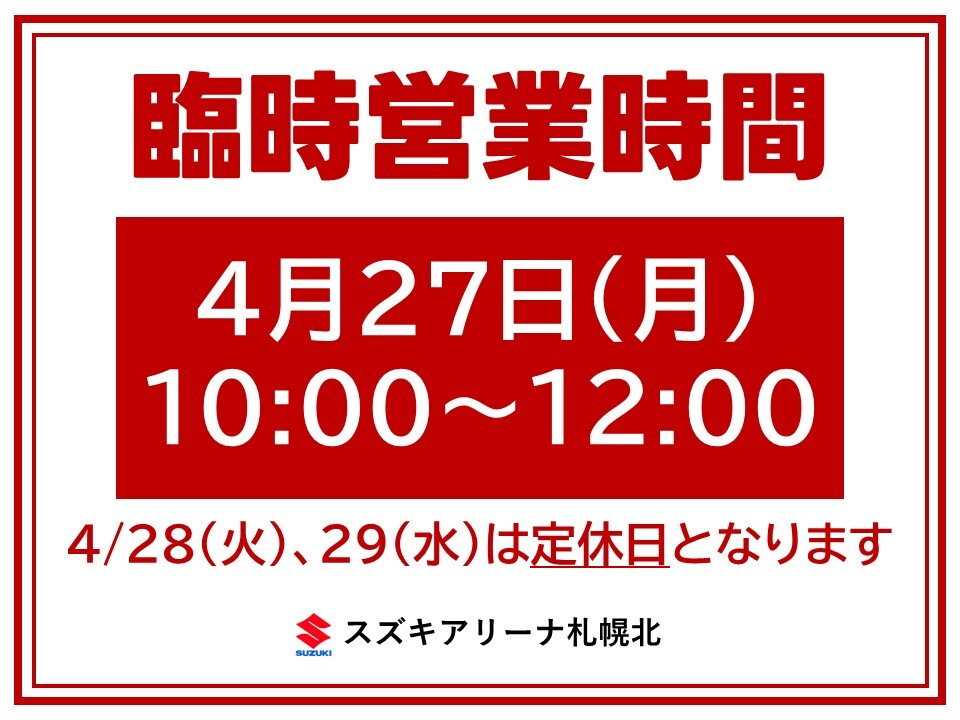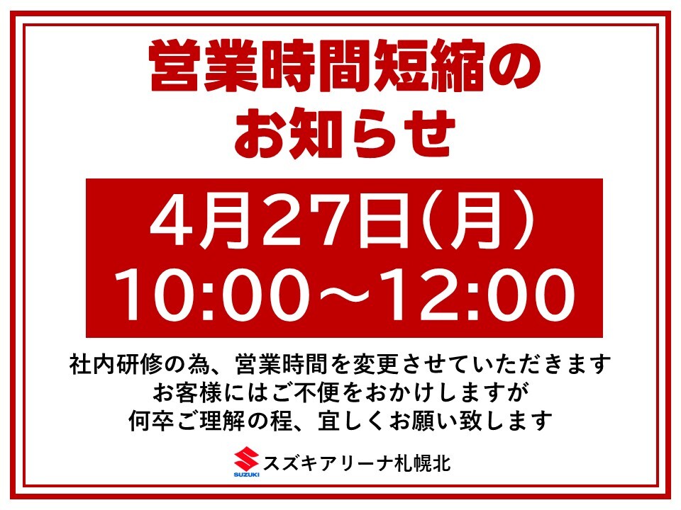 その他 2026.04.17 **4/27(月)営業時間変更のお知らせ** いつも当店をご利用いただき ありがとうございます 誠に勝手ではございますが 4月27日(月)は社内研修の為 営業時間を変更させていただきます お客様には大変ご不便をおかけいたしますが 何卒ご理解いただきますようお願い致します 尚、4月28日(火)、29日(水)は定休日の為 4月30日(木)から通常どおり営業させていただきますので 皆様のご来店をスタッフ一同 心よりお待ち申し上げます スズキアリーナ札幌北 店長 藤枝 大介