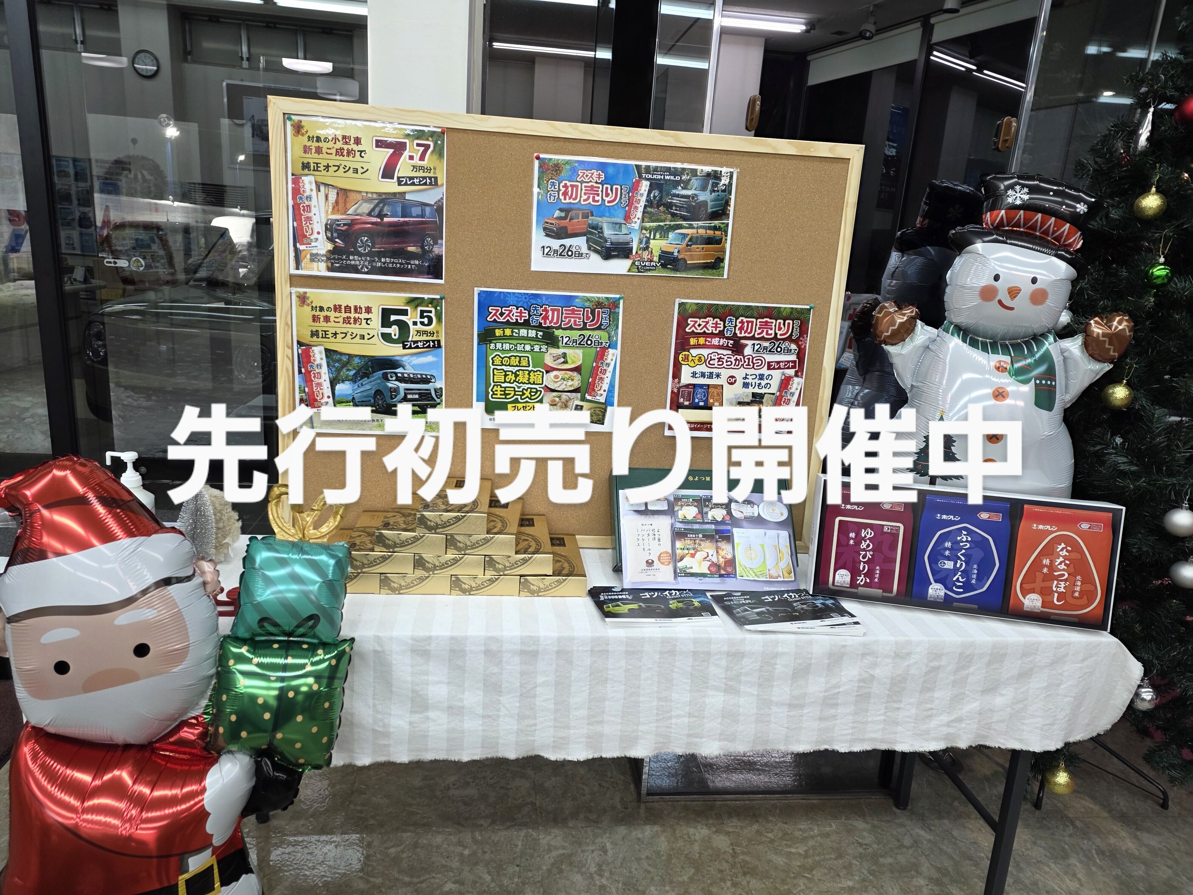 イベント/キャンペーン 2025.12.11 先行初売り キャンペーン期間:2025.12.01~2025.12.26 いつもブログを閲覧いただきありがとうございます。 皆さん、もう先行初売りに来店いただきましたでしょうか 当店でも、サンタが特典とともに 皆さまをお出迎えしております。 ・試乗・査定・お見積もり おいしいラーメンプレゼント ・ 新車ご成約で 北海道米 か よつ葉の贈りもの どちらかプレゼント ・対象の新車をご成約で スズキの純正オプションプレゼント 、まずはご来店ください。 そして、お話を聞かせて下さい。 新車のお問い合わせはこちら