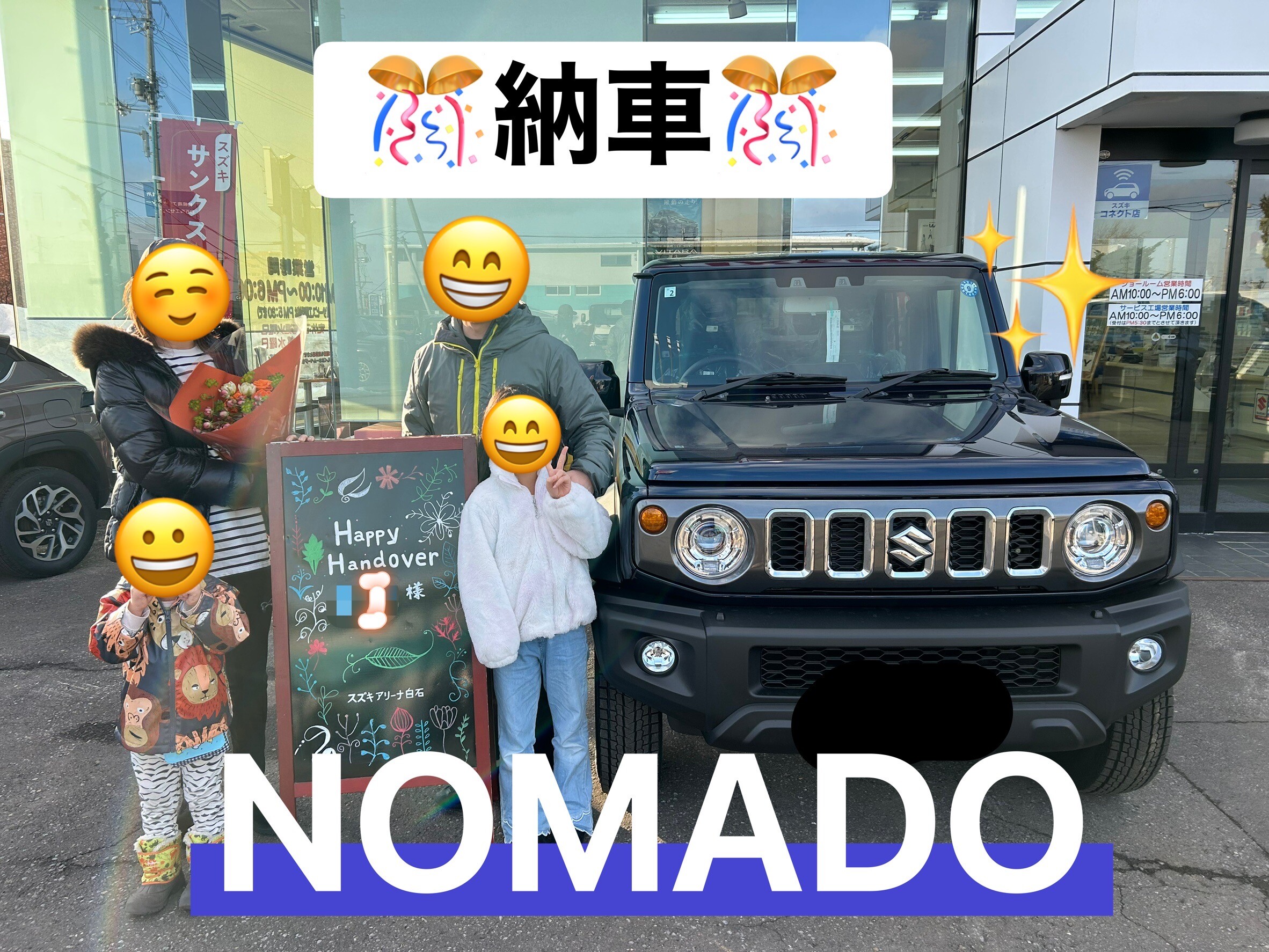 納車ギャラリー 2026.03.08 大変お待たせいたしました!ご納車おめでとうございます! 愛車 ジムニー ノマド お客様 I様 グレード FC ボディーカラー セレスティアブルーパールメタリック スズキアリーナ白石のホームページをご覧いただきありがとうございます。 先日ご納車させていただいたI様のジムニーノマドをご紹介いたします。 お車はこちらでございます!! 発売とほぼ同時にご注文いただき、、、 約1年大変長らくお待ちいただき誠にありがとうございます! 大雪も坂道も安心してお乗りいただけます I様、今後とも末永くよろしくお願い致します! またご家族皆様でのご来店お待ちしております