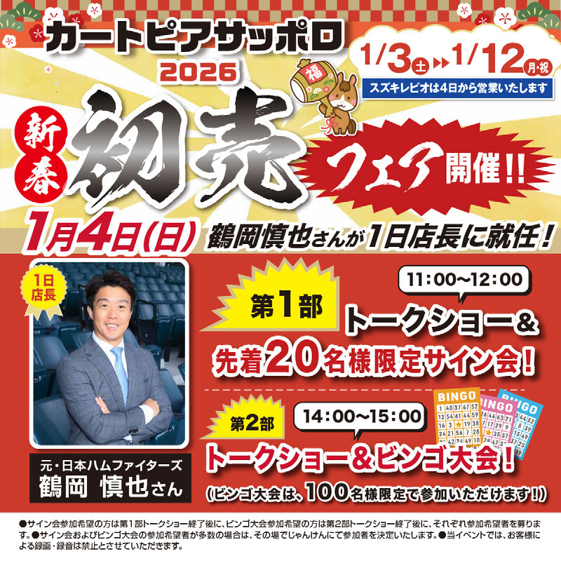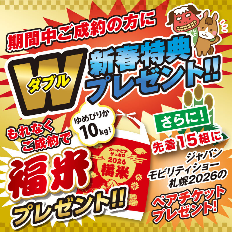 イベント/キャンペーン 2025.12.17 初売りフェア開催&元日本ハムファイターズ 鶴岡慎也さんトークショー開催! キャンペーン期間:2026.01.04~2026.01.12 2026年、初売りフェアと元日本ハムファイターズ 鶴岡慎也さんトークショー開催にご案内です。 2026年1月4日~12日まの期間内にご契約頂いたお客様には、 ゆめぴりか10キロをプレゼント致します。 また、先着15組様限定で、ジャパンモビリティショー札幌2026のペアチケットをプレゼント致します。 1月4日には元日本ハムファイターズ 鶴岡慎也さんトークショーを開催致します! ぜひ皆様のご来店お待ちしております。