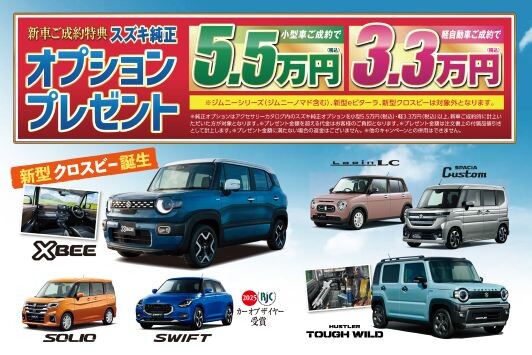 イベント/キャンペーン 2025.10.31 スズキの日 11月1日~10日は 「スズキの日 秋の大感謝祭」を開催します 新車ご商談プレゼント「ぶるぶるリラックスロボ」 新車ご成約プレゼント「選べる特選ギフト」 その他 各種特典をご用意しております また 11月末まで「スズキ 愛車無料点検」も実施中です! 11月1日~9日は 新型クロスビーなど話題のスズキ車が勢揃いの、スズキの日の のぼりのお店へお越しくださいませ (函館スズキ販売は、11月3日・4日・10日・11日はお休みをいただきます)