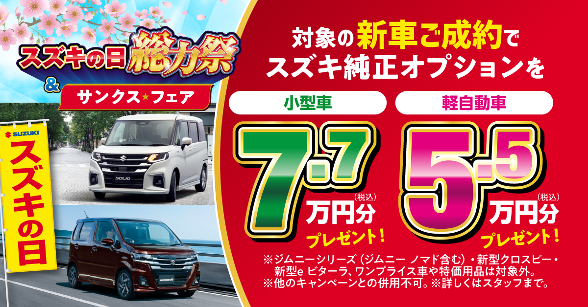 ※ジムニーシリーズ(ジムニーノマド含む)、新型クロスビー、新型eビターラ、およびワンプライス車や特価用品はオプションプレゼント対象外となります。
