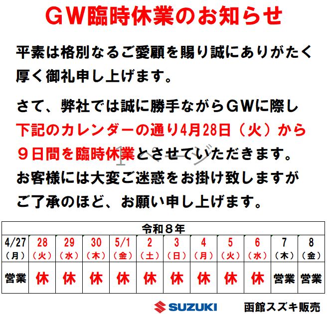 その他 2026.04.23 長期休暇のお知らせ 誠に恐れ入りますが、 上記期間中、お車の急な故障や事故の際には 下記のご連絡先までご連絡をお願いいたします。 ■JAF 日本自動車連盟■ 電話番号 0570-00-8139 または 短縮ダイヤル #8139 当社にて保険をご加入いただいているお客様 ■東京海上■ 0120-119-110 ■損保ジャパン■ 0120-256-110 までご連絡をお願いいたします。 5月7日(木)から通常営業となります