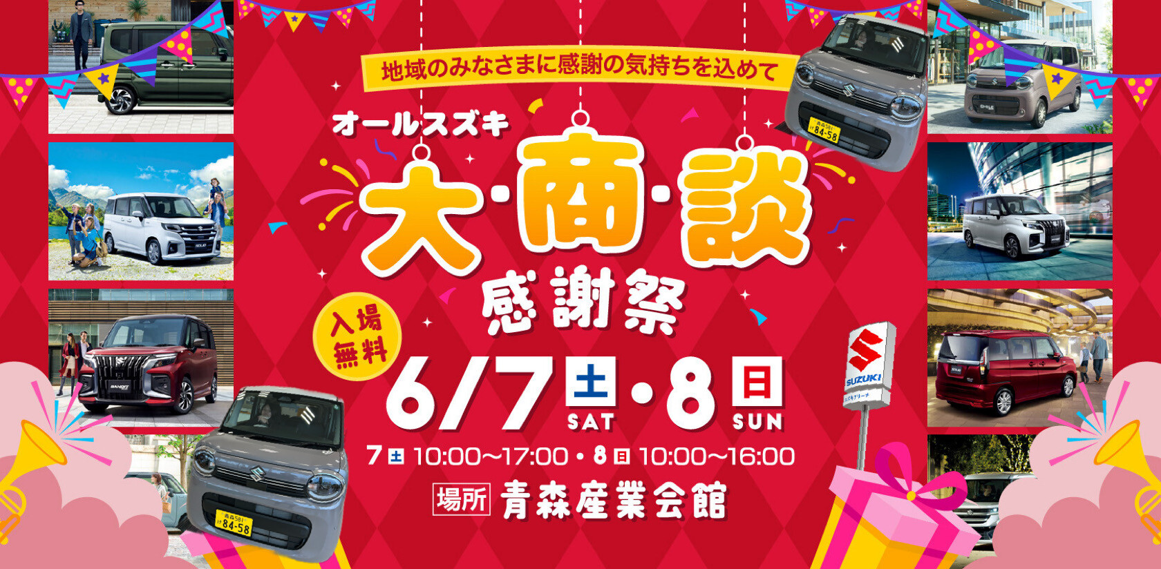 イベント/キャンペーン 2025.05.26 6月7日-8日は!!オールスズキ~大・商・談感謝祭~開催!! ※このイベントは終了しました いつもスズキアリーナ青森西の ホームページをご覧いただき 誠にありがとうございます 本日はイベント開催のお知らせです 6月7日(土)・8日(日) 青森産業会館にて オールスズキ 『大・商・談 感謝祭』 を開催いたします スズキの新車&中古車を 一挙100台展示!!! 中古車には目玉車も!!! (限定1台早いもの勝ち) 会場では 純正オプションを多数装備した 特別展示車も 楽しいイベントも盛りだくさん トーク&ライブ【ジョナゴールド】 6/7(土) 11:00~ 13:00~ トーク&ライブ【りんご娘】 6/8(日) 11:00~ 13:00~ 【キッズエンジニア】 6/7(土)・6/8(日) 11:30~ 13:30~ 14:30~ ▶ セニアカー試乗体験 ▶ キッチンカー ▶ スタンプラリー抽選会 ▶ キッズコーナー (らくがきカー・縁日など) ▶ タイヤ・用品展示販売 イベント盛りだくさんの2日間 入場は無料です 開催時間は 6/7(土) 10:00~17:00 6/8(日) 10:00~16:00 皆さまのご来場をお待ちしております