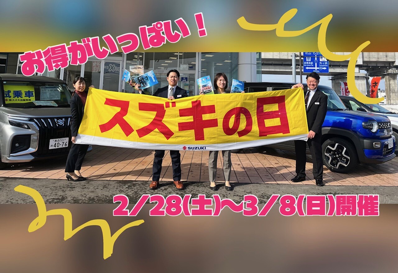 イベント/キャンペーン 2026.02.23 ★☆【開催決定】スズキの日☆★ キャンペーン期間:2026.02.28~2026.03.08 皆様こんにちは! いつもブログをご覧いただき、 ありがとうございます 毎回大好評の スズキの日 2/28(土)~3/8(日)開催します! ご商談・ご成約で お得な特典が盛りだくさん 2/28(土)~3/8(日)開催です! この機会にぜひご来店ください 皆様のお越しをお待ちしております!