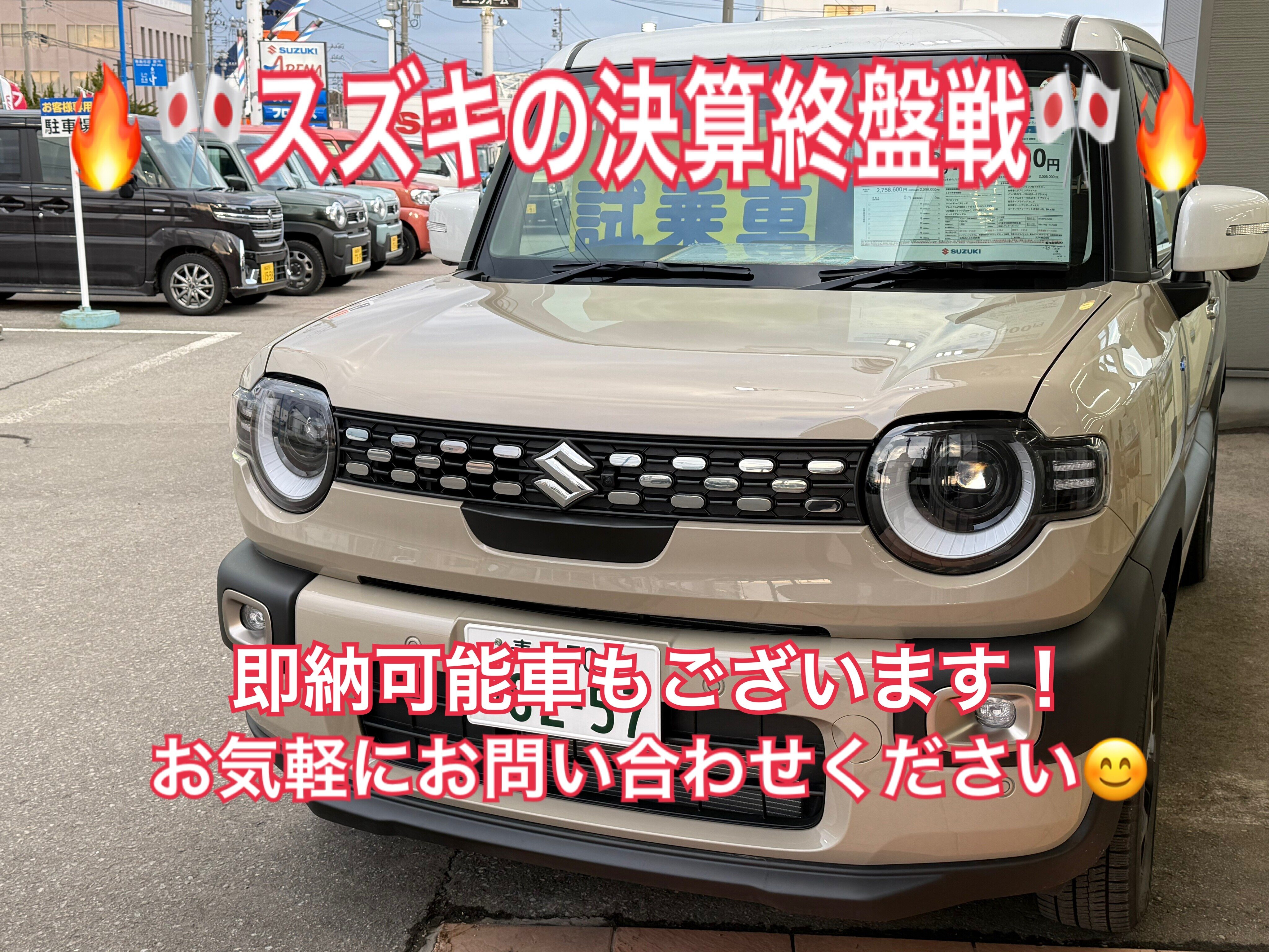 イベント/キャンペーン 2026.03.16 スズキの決算終盤戦!今週末は当店へお越しください☆ キャンペーン期間:2026.03.20~2026.03.22 いつも当店のホームページを ご覧いただきありがとうございます 3月も半ばを過ぎ後半へ差し掛かってきました スズキの決算も終盤戦 お車の購入は今がチャンス! 在庫があれば即納も可能です!!! 気になるおクルマございましたら お気軽にお問い合わせください スズキ残価設定クレジット 「かえるプラン」特別金利キャンペーン も今月末までです! お得な2.9%は今月末まで!!! 今がチャンスです!!! ▼試乗予約はこちらからもできます▼ 今週末もみなさまのご来店を 心よりお待ちしております