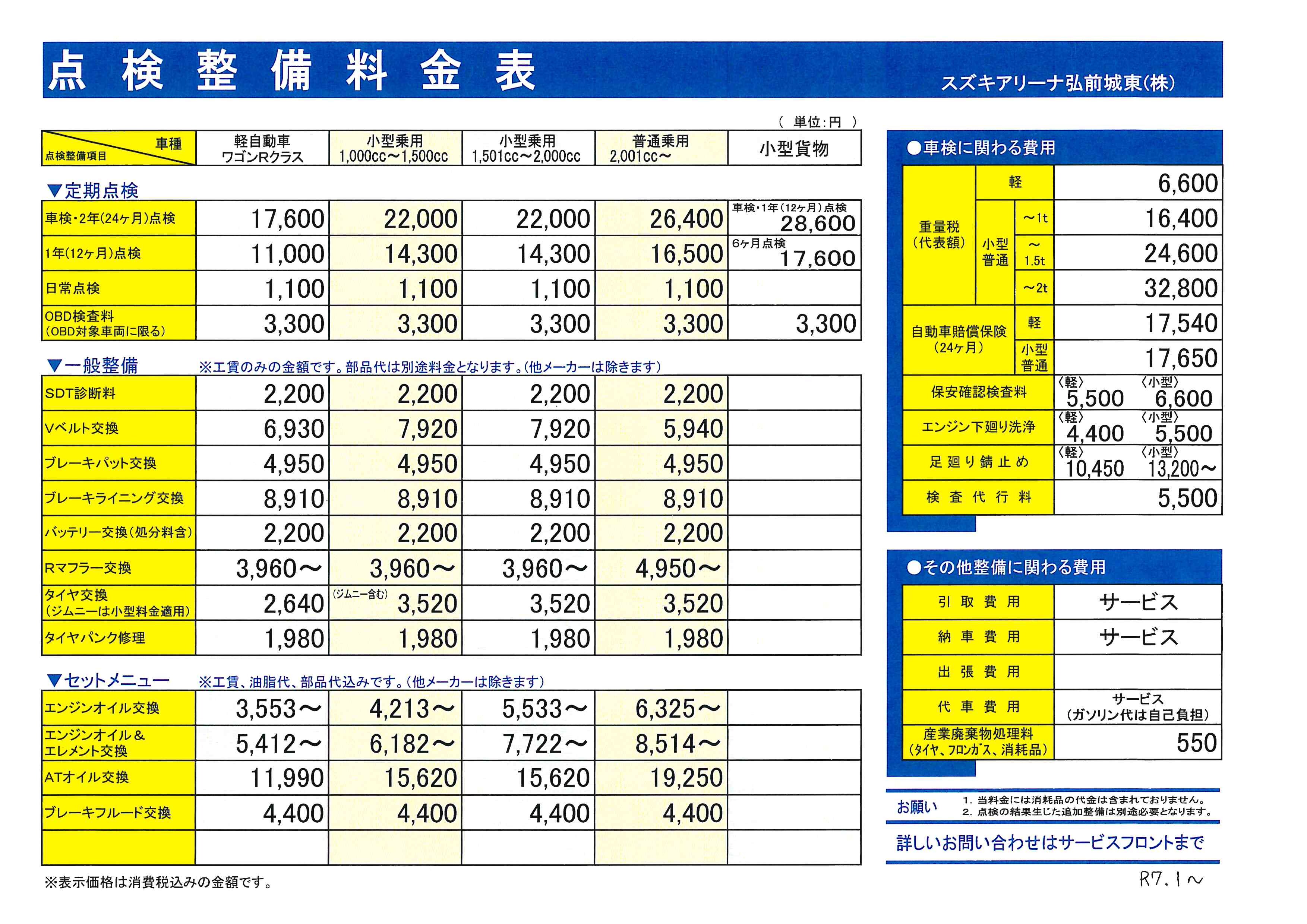 点検整備料金表のご案内