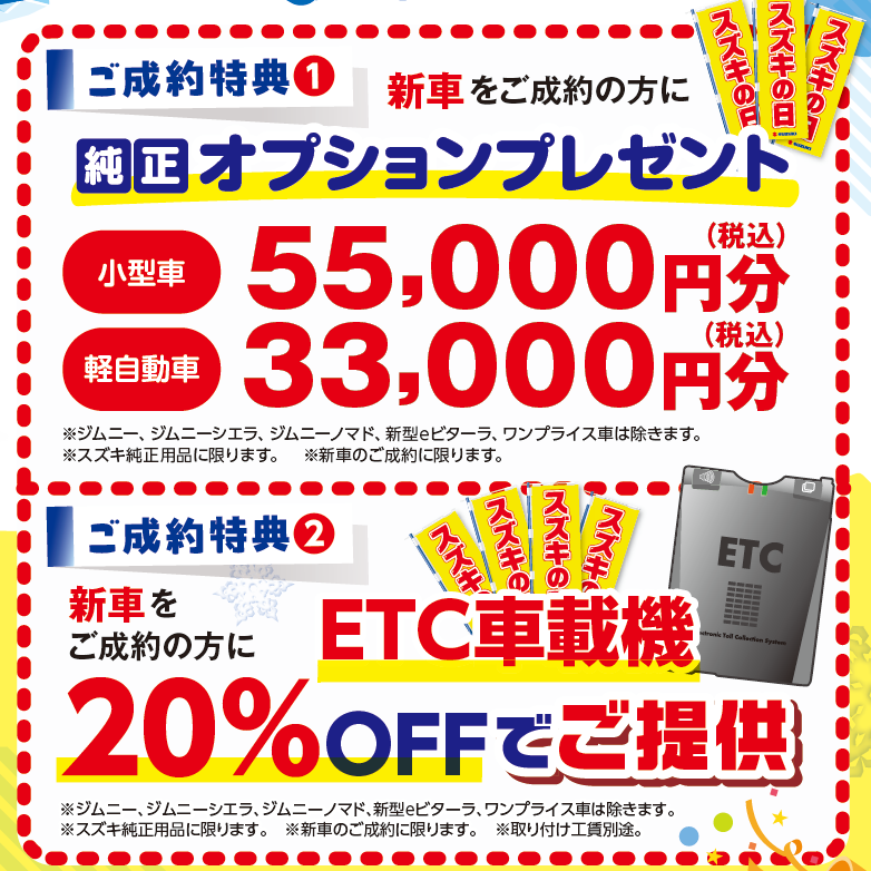 イベント/キャンペーン 2026.01.26 スズキの日!!開催ですよ~★ キャンペーン期間:2026.01.31~2026.02.08 当店のホームぺージをご覧いただき \ありがとうございます/ 早速ですが 1/31(土)~2/8(日)まで スズキの日 開催いたします!! ↑ 新型ワゴンR ご試乗可能になりました~~~ ご試乗いかがでしょうか \ご試乗お待ちしております/ そして スズキの日、期間中は 特典盛沢山っ!! 今回もお得が沢山のスズキの日となっております \皆様のご来店お待ちしております/