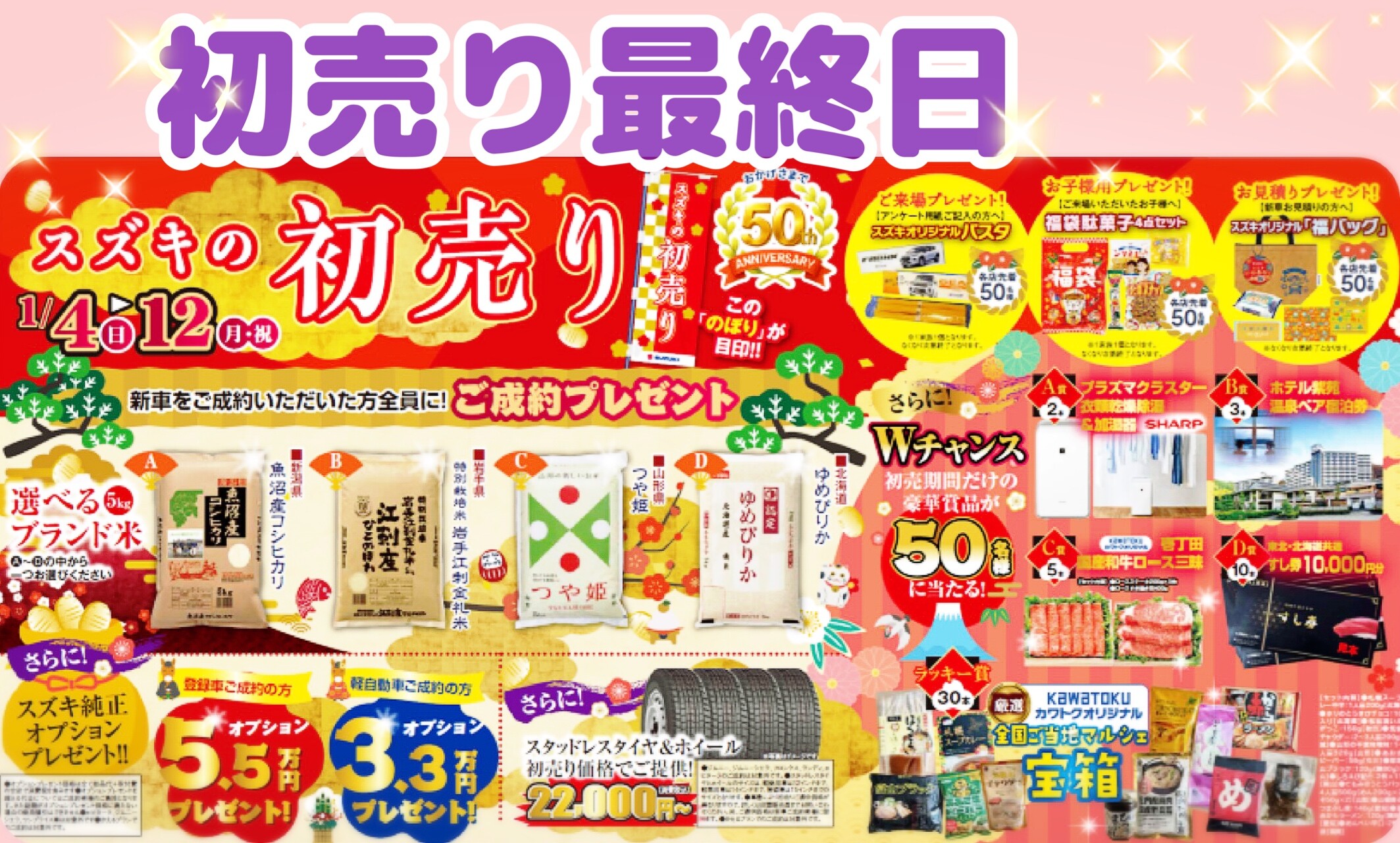 イベント/キャンペーン 2026.01.12 初売り最終日です!! こんにちは 今日で3連休最後の日となりますね 3連休だけではなく初売りも最終日となります!!! まだお悩みの方この機会にぜひご来店ください A盛岡西