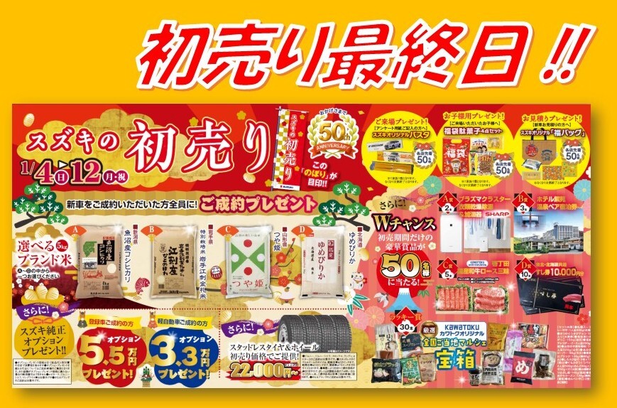 イベント/キャンペーン 2026.01.12 初売り最終日!奥州店へお待ちしております☆ こんにちは! 今日は朝から雪が積もりましたね しばらくはお天気予報が雪マークでしたので、 運転の際はお気を付けください 4日から開催している スズキの初売りも いよいよ本日が最終日!!! まだ悩まれている方も、 これから検討される方も、 本日までですので、是非ご来店をお待ちしております 今なら豪華景品が当たるチャンス この機会にお見逃しなく!! A奥州 TEL:0197-24-5411