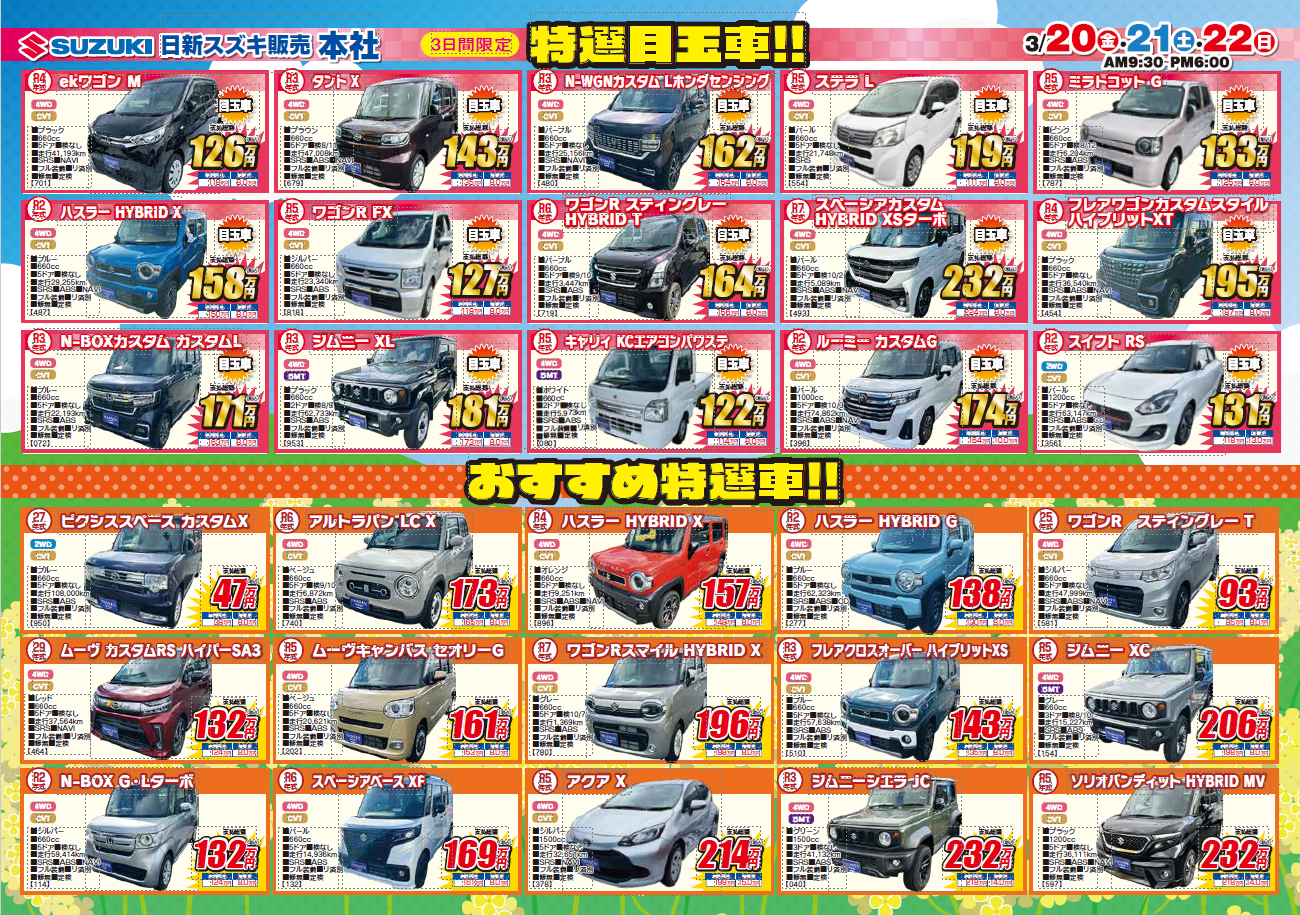 イベントデー 2026.03.19 サンクス☆フェア キャンペーン期間:2026.03.20~2026.03.22 日新スズキ販売(株)本社のブログをご覧いただきまして ありがとうございます 3/7(土)・8(日)のサンクス☆フェア第一弾には たくさんのご来場いただきましてありがとうございます 第一弾で決めきれなかったお客様はチャンスです 3/20㈮・21㈯・22㈰ サンクス☆フェア第二弾やっちゃいます!!! 今回も第一弾と同様ご成約プレゼントご用意しております また3日間限定目玉車もご用意しております 皆様のご来店心よりお待ちしております ではまた~