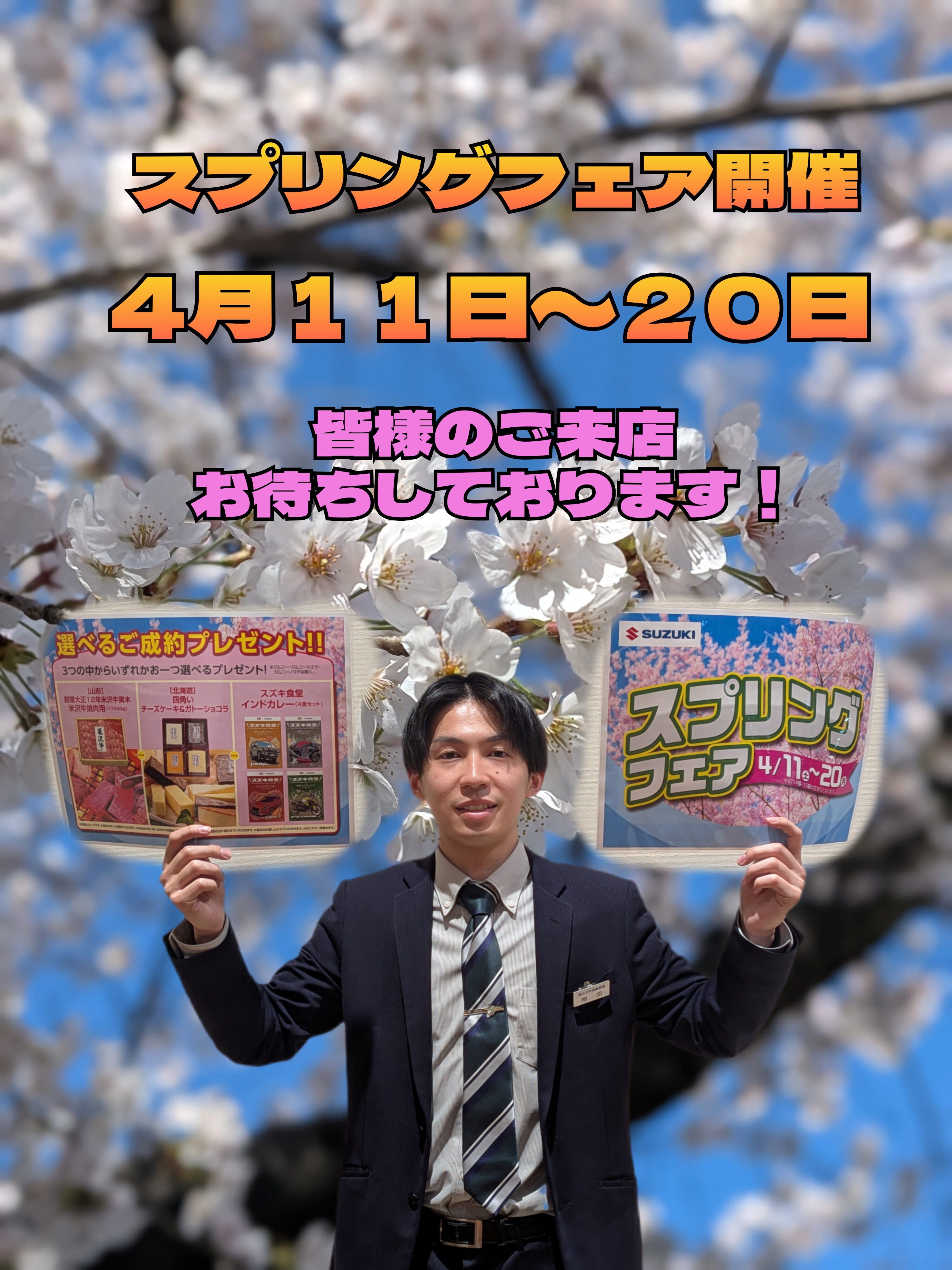イベント/キャンペーン 2026.04.09 !スプリングフェア開催! キャンペーン期間:2026.04.11~2026.04.20 4月11日~20日で スプリングフェア 開催 豪華なご成約特典もご用意 皆様にとっておきの1台をご案内します 自動車だけではなく自動車保険の相談も受付中 この機会に見直しはいかがですか? 週末はアリーナ苦竹店へ 皆様のご来店をスタッフ一同 心よりお待ちしております