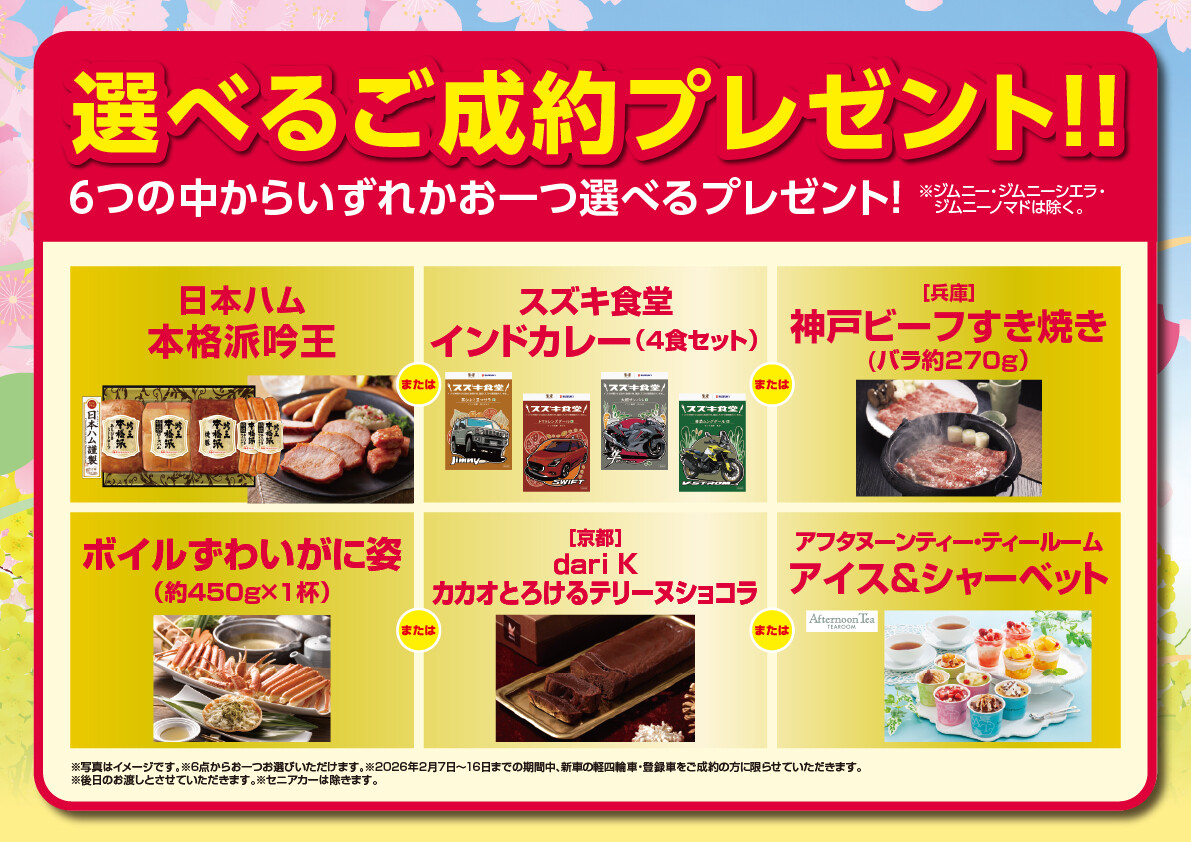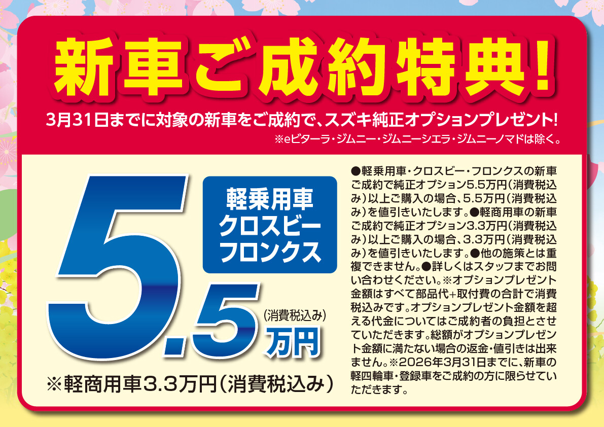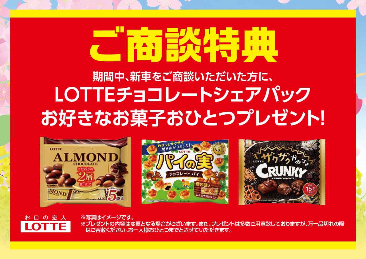 イベント/キャンペーン 2026.02.06 春の大商談会開催いたします みなさま、こんにちは!! いつもスズキアリーナ太白店の ブログをご覧いただき 誠にありがとうございます 今回はイベントのご案内です スズキ春の大商談会 2月7日(土)~2月16日(月) 特典①チョコレートプレゼント 期間中新車をご商談頂いたお客様に お好きなチョコレート お一つプレゼント 特典②新車ご成約で純正オプションプレゼント 特典③選べるご成約プレゼント みなさまのご来店 太白店のスタッフ一同 心よりお待ちしております。