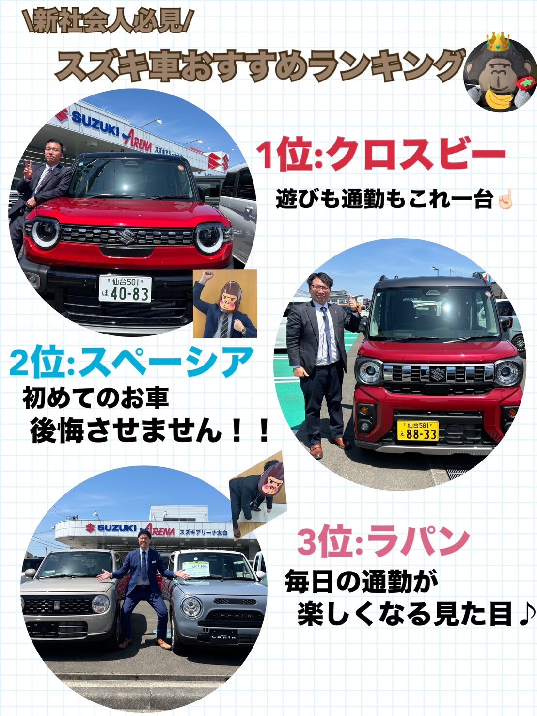 その他 2026.04.24 新社会人におすすめ!!スズキ車ランキング作ってみました!! みなさま、こんにちは!! いつもスズキアリーナ太白店の ブログをご覧いただき 誠にありがとうございます 毎日お掃除で大活躍の私のランキングですウホ 今回は、新社会人のみなさまへ おすすめなお車を ランキング形式でご紹介いたします 1位:クロスビー ・見た目がおしゃれで個性的 ・荷室が広く、友達とアウトドアや旅行に最適 ・車高が高く運転しやすい+雪道も安心 2位:スペーシア ・視界が広く運転しやすい(初心者でも安心) ・とにかく室内空間が広い ・スライドドアで乗り降りラクラク +狭い駐車場でも安心 3位:ラパン ・デザインがとにかく可愛い ・小回りがきいて運転しやすい ・燃費が良く維持費が安い 太白店では、試乗車展示車取り扱いがございます。 ぜひ、ご来店ください。 みなさまのご来店 太白店のスタッフ一同 心よりお待ちしております。