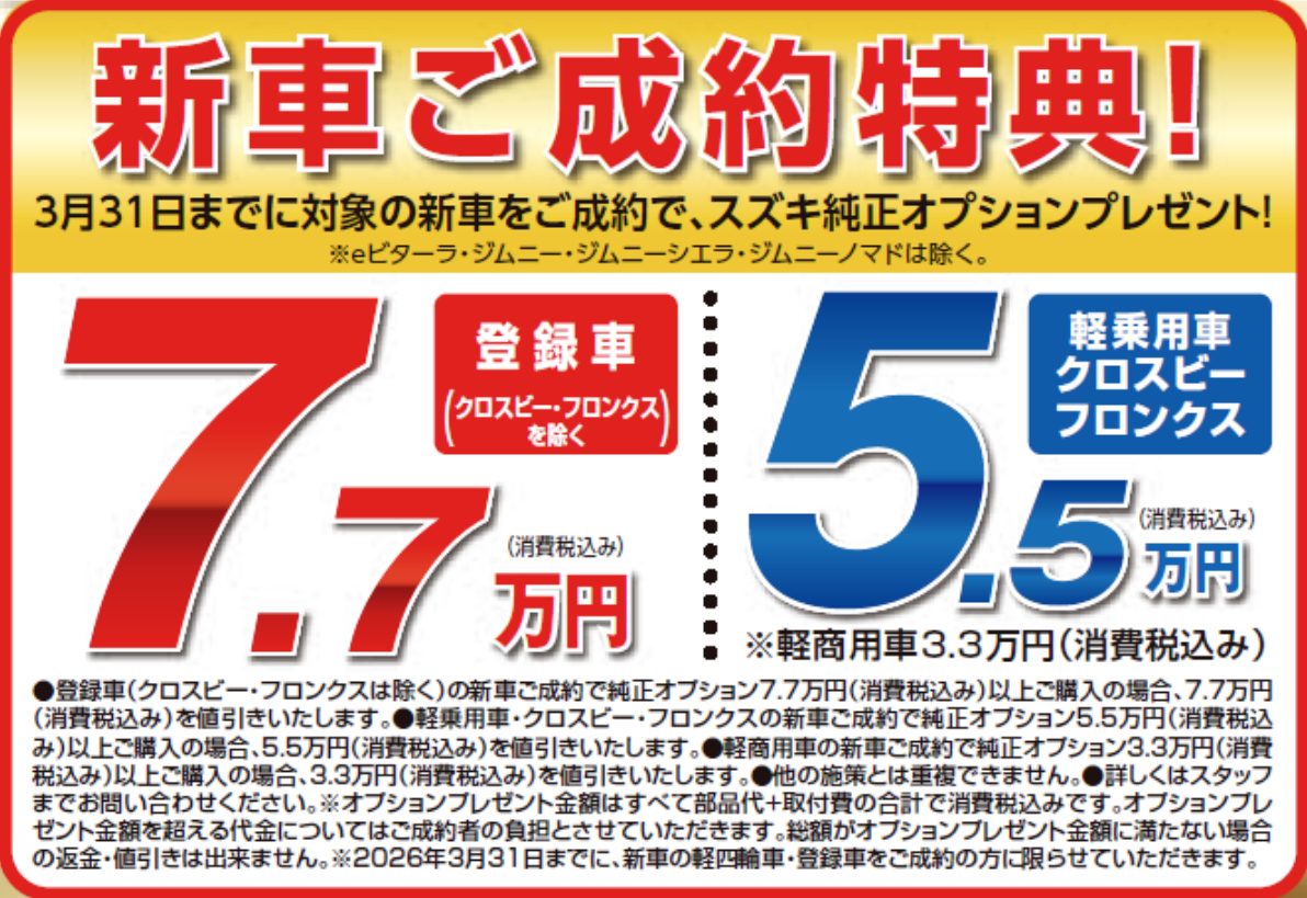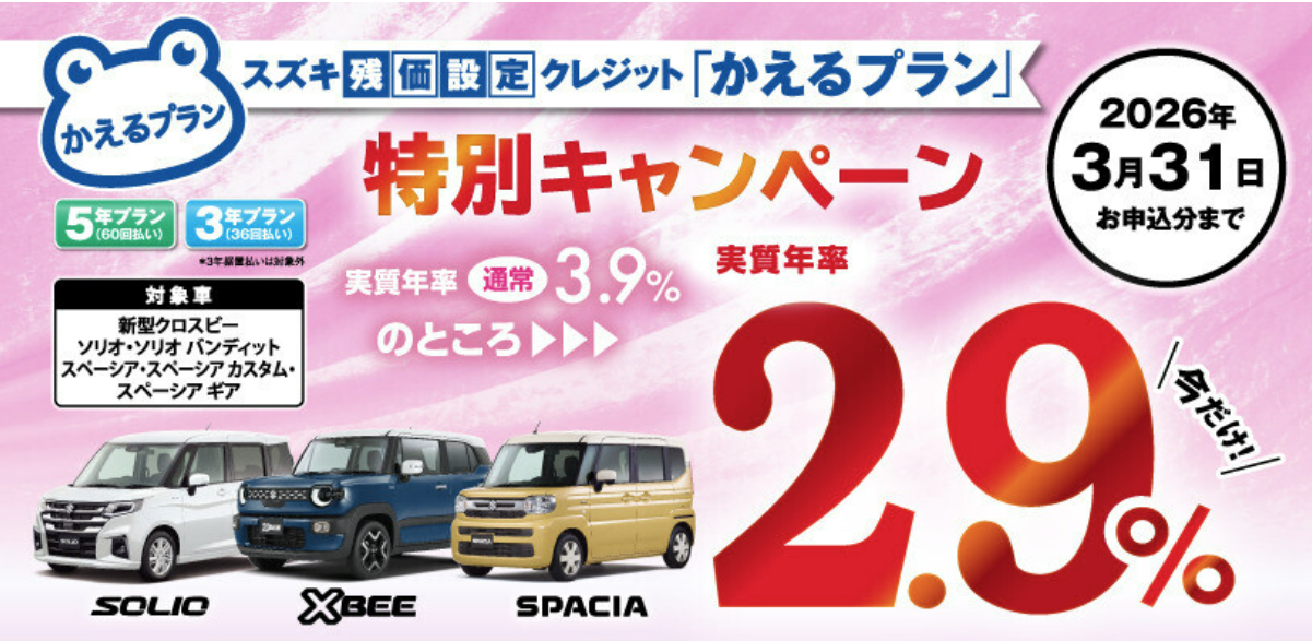 イベント/キャンペーン 2026.03.19 【3月末まで!!】決算はまだまだ終わりません!!! キャンペーン期間:2026.03.19~2026.03.30 みなさまこんにちは! スズキアリーナ名取です いつもブログをご覧いただき 誠にありがとうございます 最近花粉がすごいですね。。。 3月決算です 明日から3連休ですね! 週末はどのようにお過ごしでしょうか 実は3月末までに スイフト・ソリオ にお乗り換え (下取り車あり)で 純正オプション3.3万円 がプレゼントになるんです! さらにさらに! かえるプランの特別金利も 3月末まで ※対象車 ・スペーシア ・スペーシアカスタム ・スペーシアギア ・ソリオ ・ソリオバンディット ・クロスビー 軽自動車の金利1%の違いで 総額より¥47,000ほど おトクに購入できます! ↓↓↓↓↓↓↓↓ 今月中にご相談ください! 詳しくは店頭へ スタッフ一同 お待ちしております