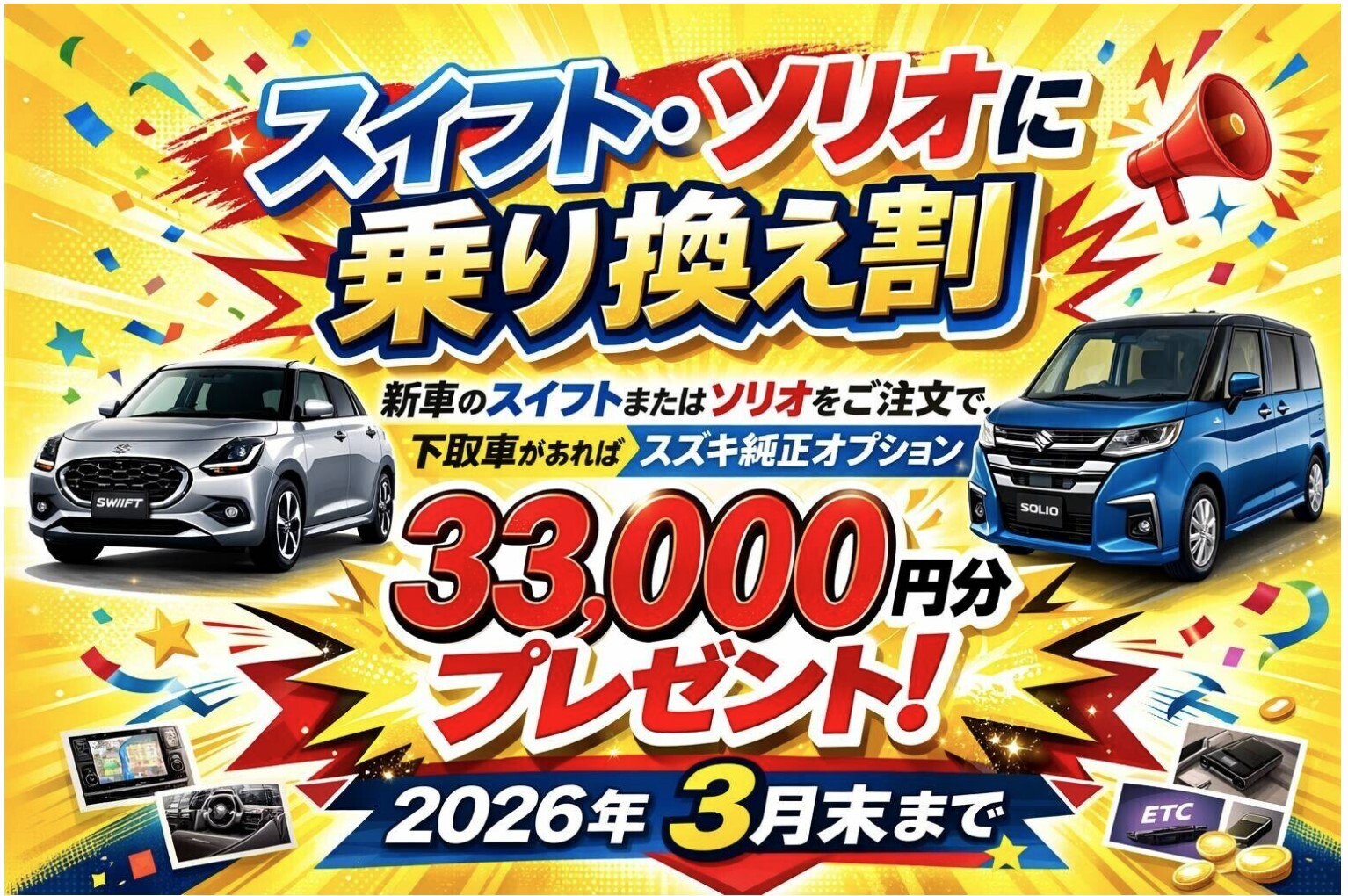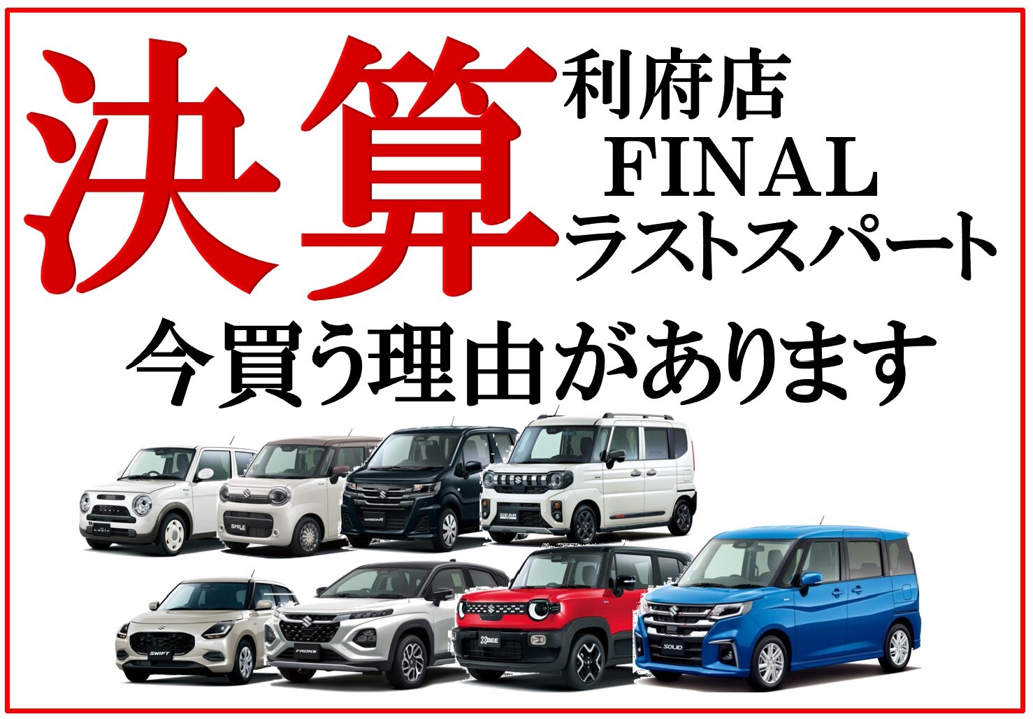 その他 2026.03.21 利府決算フェア ラストスパート! アリーナ利府店です スズキ大決算展示会では 多くのお客様に ご来場いただきまして ありがとうございます! 大決算展示会は 終わりましたが 3月末まで 決算は開催中です! お得な乗り換え割 3月末まで 実施中! お問い合わせ はお気軽に! スタッフ一同 お待ちしております!