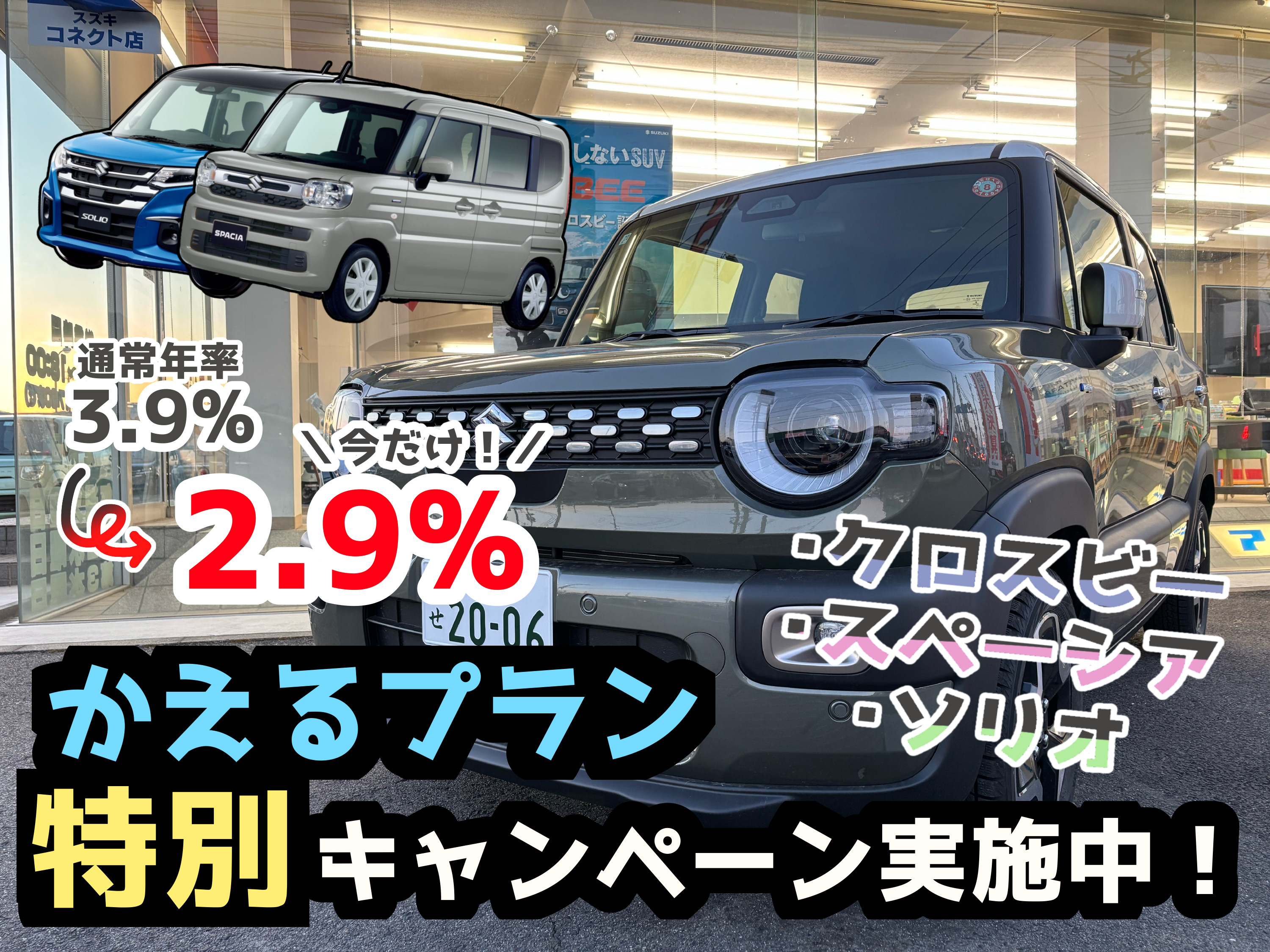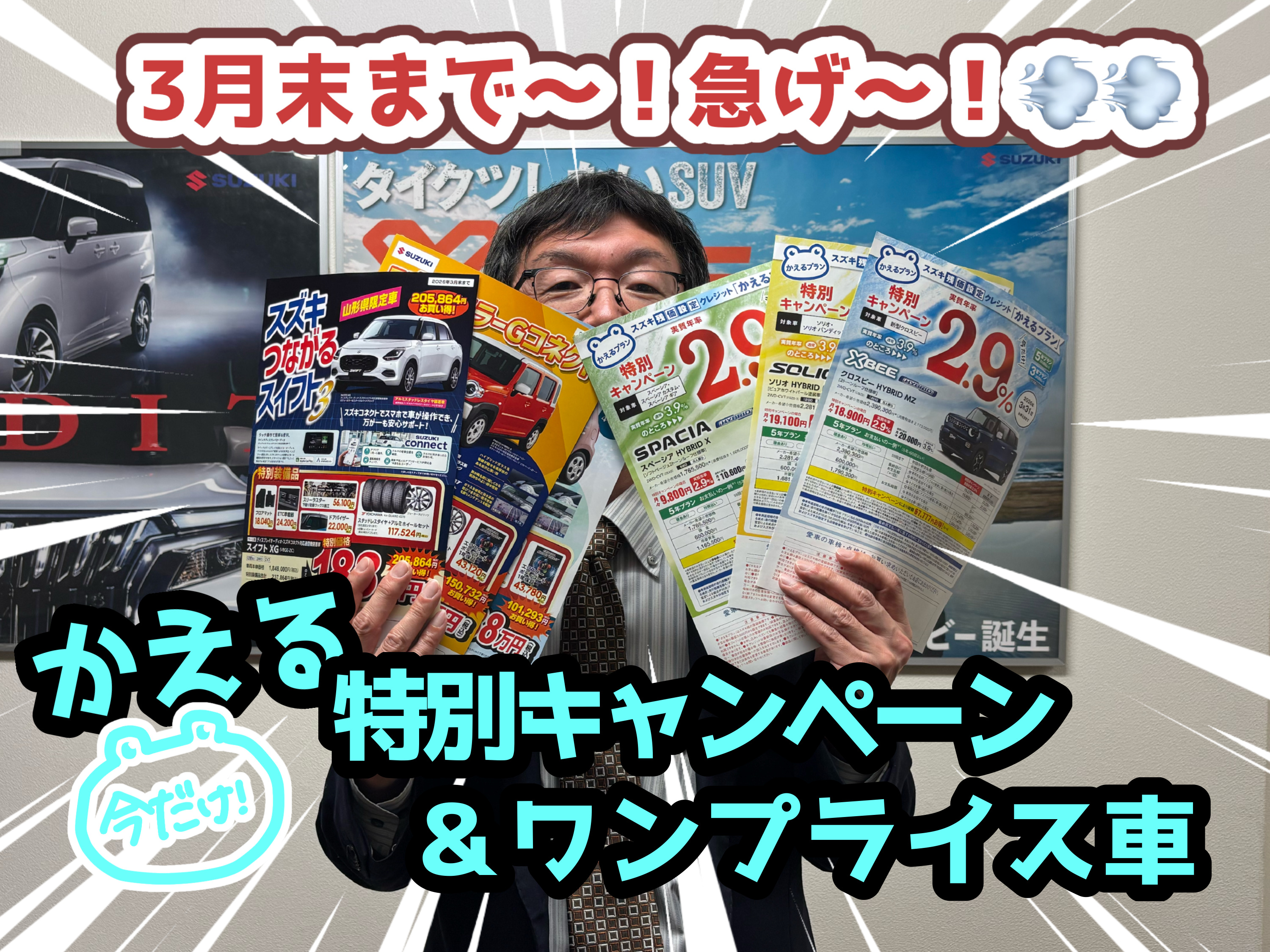 イベント/キャンペーン 2026.02.23 お得なワンプライス、かえる2.9%あります!!! みなさん こんにちは スズキアリーナ山形西のたかはしです! 今週末三連休で続いたスズキ大決算ですが 本日23日(月・祝)でラストですよ! 本日もご来店お待ちしております! 大決算も大盛り上がりなところですが ここだけ今だけの話… 今現在出ているワンプライス車も かえるプラン2.9%キャンペーンも 3月末で終わってしまいます… 新生活にむけてお車を考えているお客様! ぜひ大決算(+かえる特別キャンペーンとワンプライス車)で お車をお得に買い替えませんか? 皆様のご来店を心よりお待ちしております