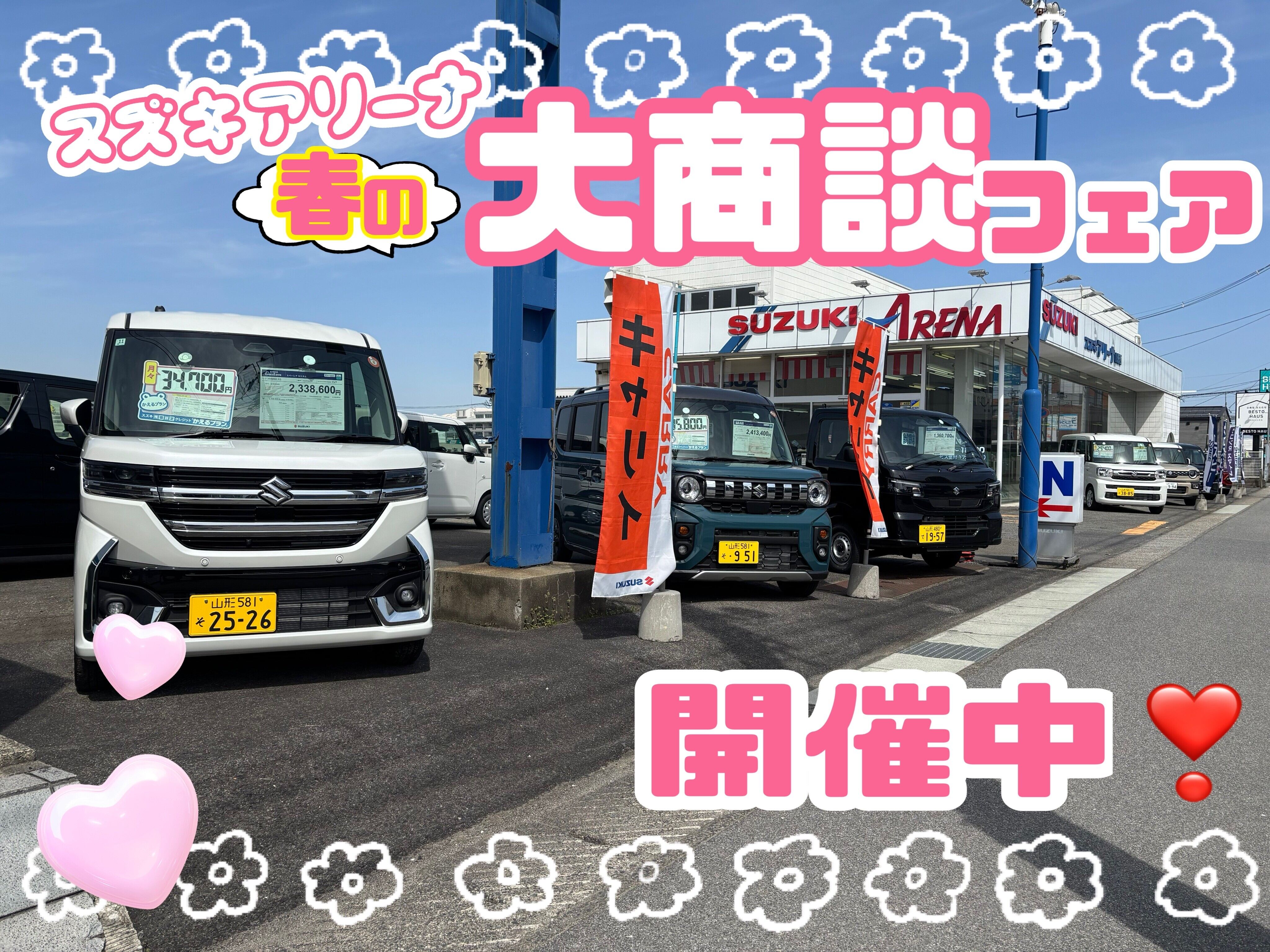 イベント/キャンペーン 2026.04.13 大商談フェア!来店お待ちしております! みなさま こんにちは スズキアリーナ山形西のたかはしです 霞城公園も桜が咲いているそうですね 皆様はお花見は行きましたか? 桜といえば春!春といえば スズキアリーナ 春の大商談フェア 開催中ですよ~!!! 新車ご成約特典 ※ジムニー、ジムニーシエラ、ジムニーノマドは除きます 4月19日(日)まで この春、新生活にむけてお車選びに悩まれている方! 今週末はぜひスズキアリーナ山形西へ! お車選びをサポートさせていただきますよ~ 皆様のご来店心よりお待ちしております