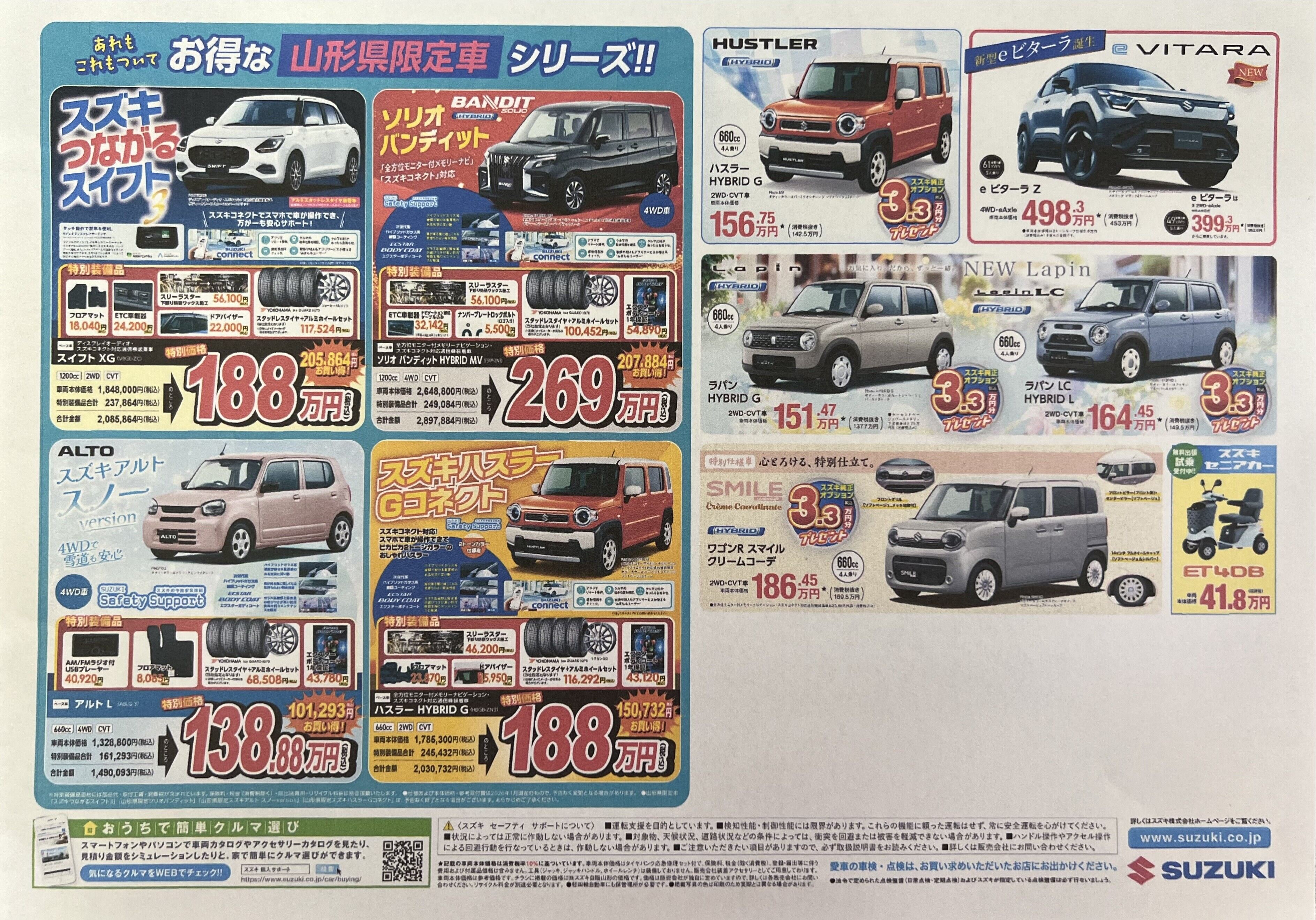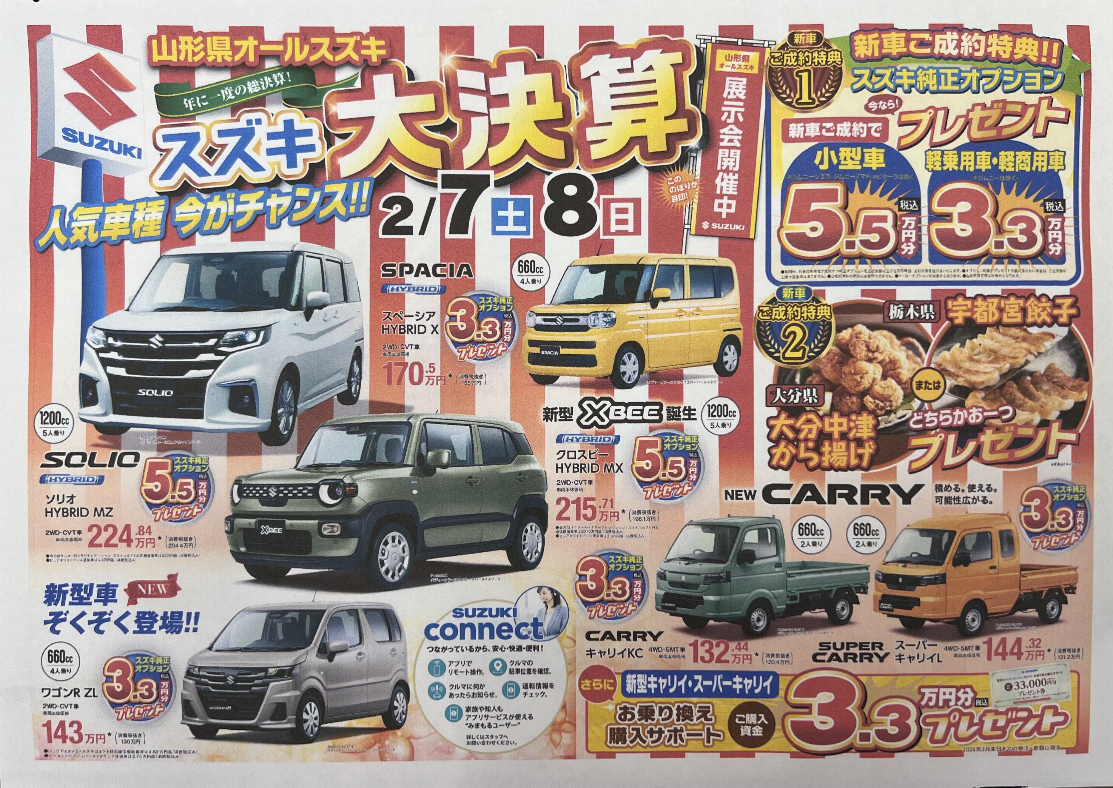 イベント/キャンペーン 2026.02.05 スズキ大決算! スズキ大決算!!年に一度の総決算! 2月7日・8日の2日間限定で人気の軽自動車から普通車、商用車まで今だけのお得な特典・プレゼントを多数ご用意しています 新車ご成約で スズキの純正オプションプレゼント から揚げ・餃子のプレゼントなど 嬉しい特典が盛りだくさん! 「そろそろ乗り換えを考えている…」「話だけを聞いてみたい」という方も大歓迎です ぜひこの機会にお気軽にご来店ください