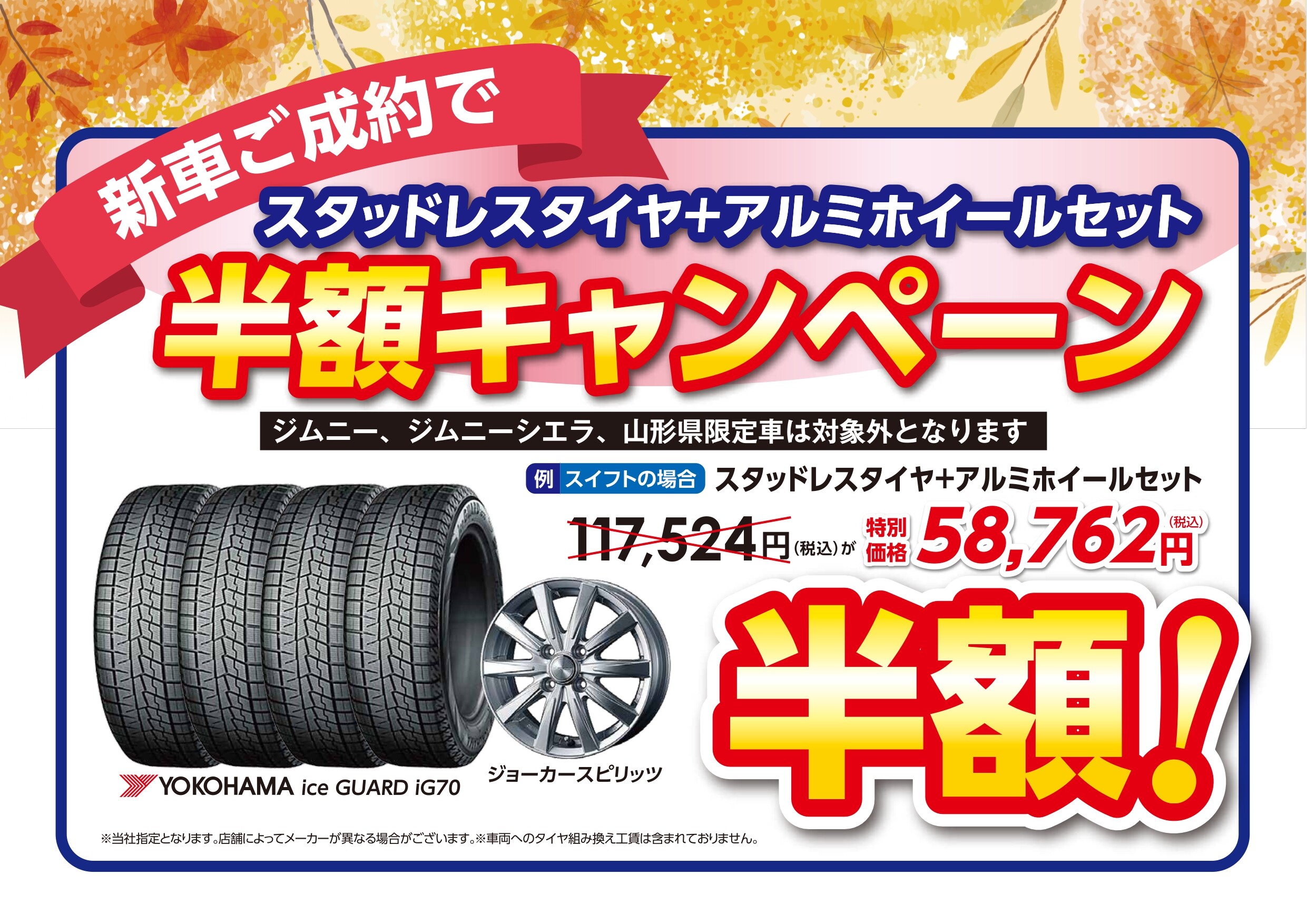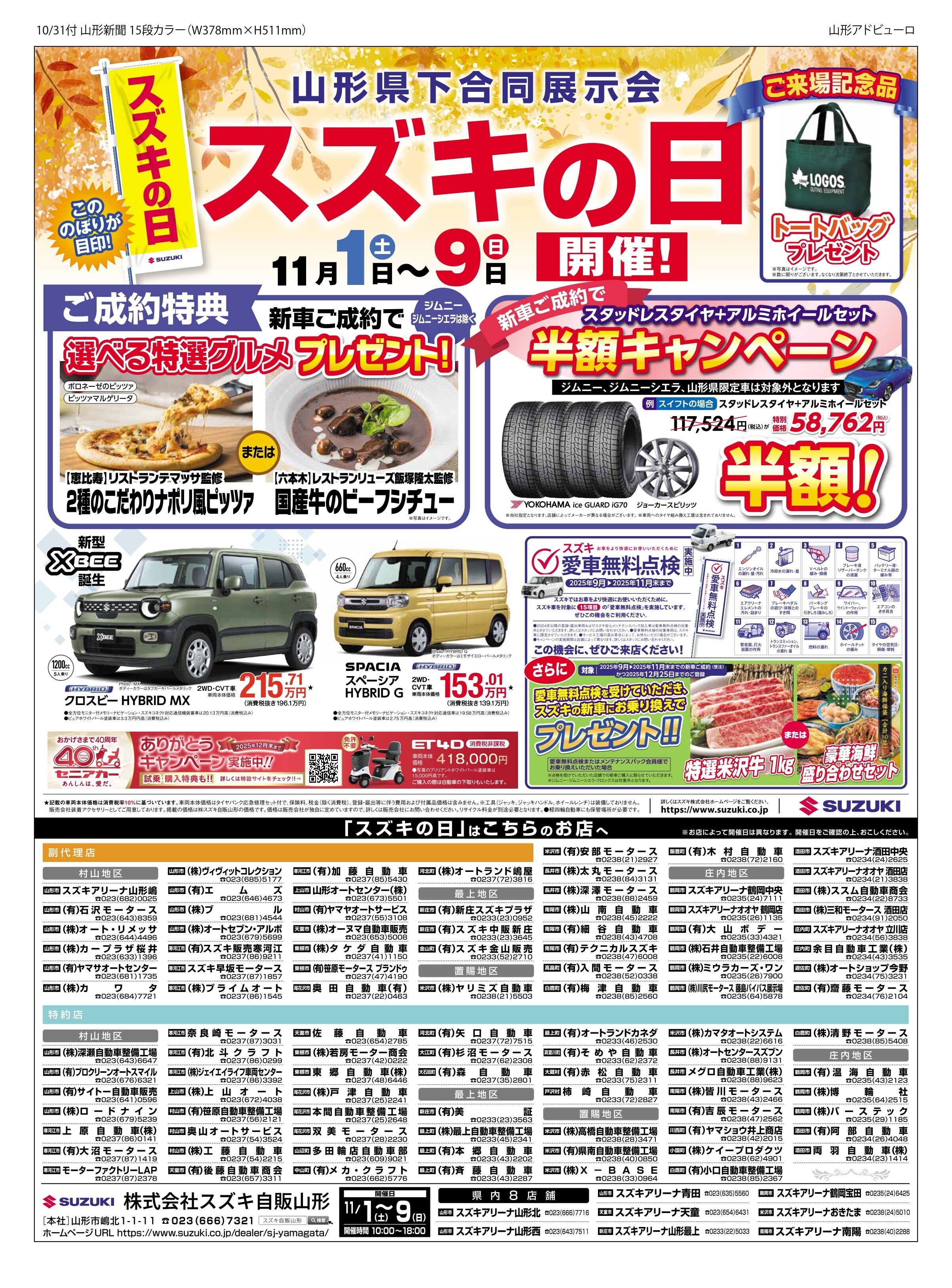 イベント/キャンペーン 2025.10.27 11月1日~9日はスズキの日! みなさんこんにちは スズキアリーナ南陽の布施です 11月1日~9日はスズキの日です! 豪華ご成約特典をご用意しております! ご成約特典① 新車ご成約でどちらかおひとつプレゼント! ※ジムニー・ジムニーシエラは除きます。 ご成約特典② 新車ご成約で スタッドレスタイヤ+アルミホイールセットが 半額! スズキの愛車無料点検をして お乗り換えいただいたお客様には下記の特典をご用意しております! ご来場プレゼントもございます 新聞掲載の内容はこちら↓ みなさまのご来店をお待ちしております