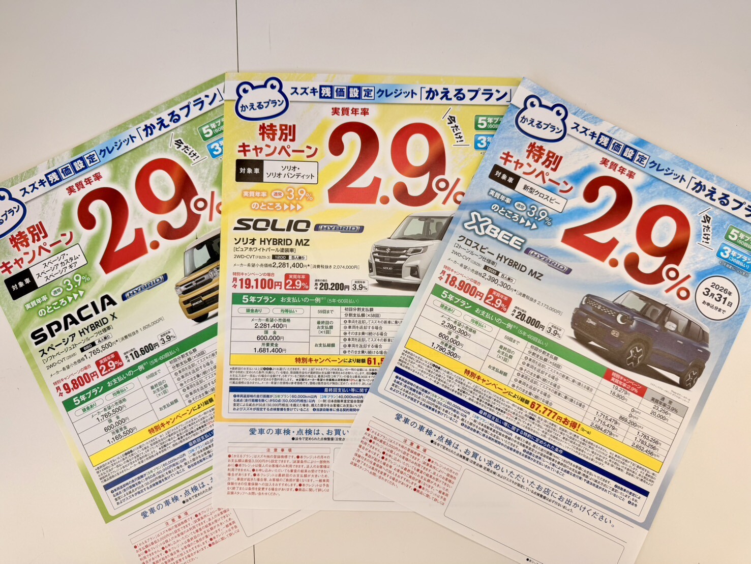新車情報 2026.03.19 かえるプラン特別金利3月31日までです いつも信夫山つうしんを ご覧いただきありがとうございます。 スズキ残価設定クレジット 「かえるプラン」 対象車種 スペーシア ソリオ クロスビー に限り、 通常金利 3.9% ↓ 特別金利 2.9% キャンペーン実施中 今月末3月31日申込分 までとなっております お得な機会ですので 是非、ご検討の方は 31日までにご来店ください スズキの残価設定クレジットについて 詳しくは こちら
