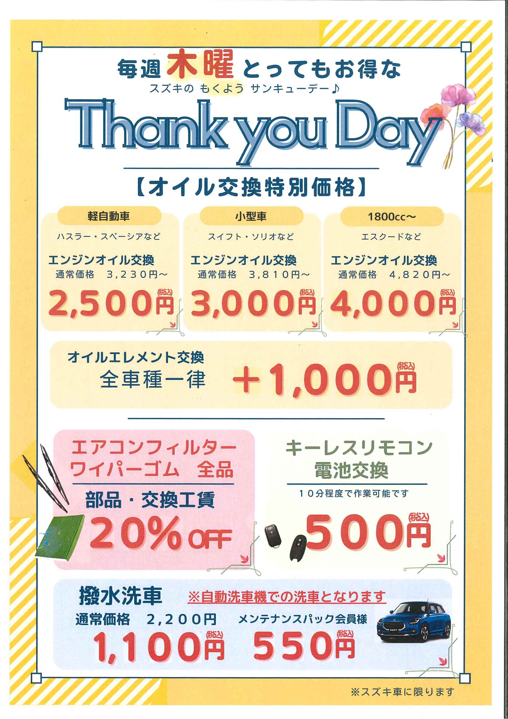 記載の通り、オイル交換等がお得に実施できる曜日になります♪