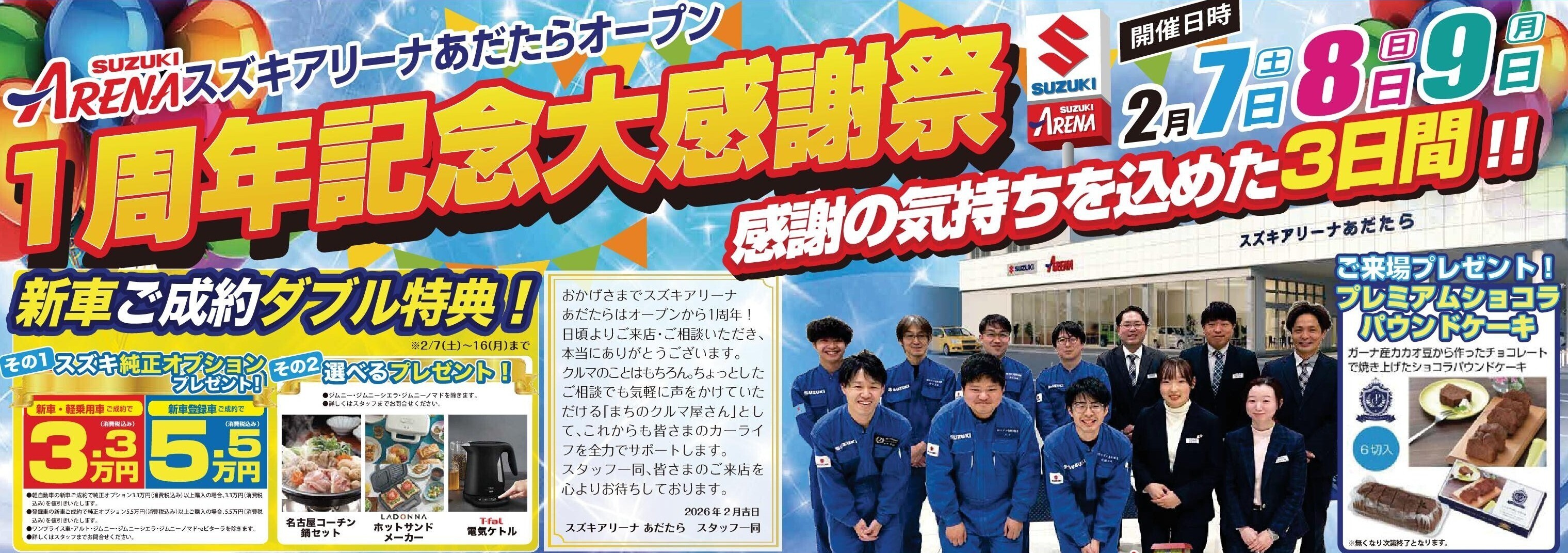 イベント/キャンペーン 2026.01.28 2/7(土)~9(月) アリーナあだたら 大感謝祭!! 2月7日(土)~9日(月) スズキアリーナあだたら 1周年記念 大感謝祭!!! 皆様のおかげで無事に1周年を 迎えることができました! 感謝の気持ちを込めて 色々な特典をご用意いたしました ★新車ご成約でダブルプレゼント!!!★ 皆様のご来店 スタッフ一同お待ちしております