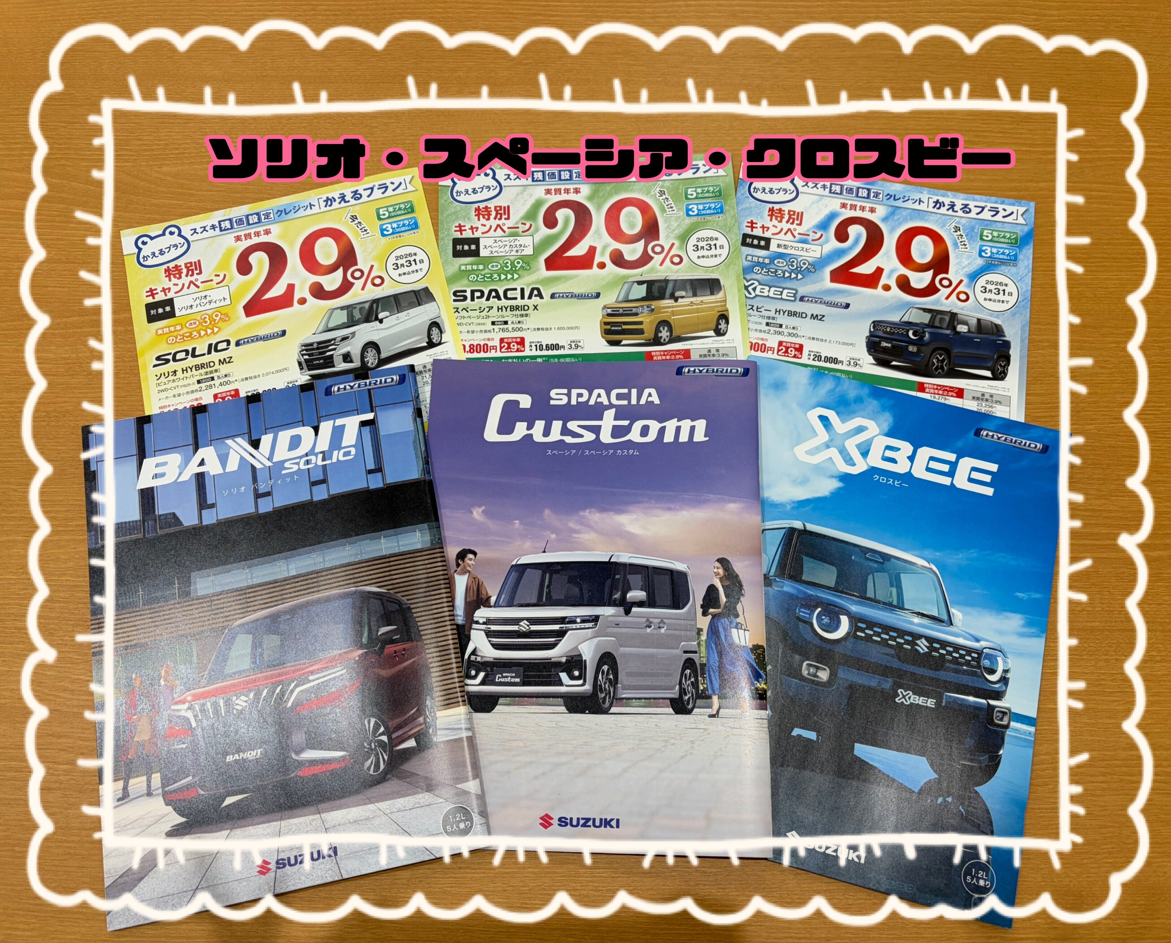 その他 2026.03.19 3月末まで特別金利実施中! いつもスズキアリーナあだたら店のHPを ご覧いただきありがとうございます! スズキ残価設定クレジット かえるプラン 特別金利キャンペーンのご案内です ソリオ・スペーシア・クロスビー 3車種限定で 金利2.9%です 期限は2026年3月31日申し込み分まで!! このお得な機会に ご来店いかがでしょうか 皆様のご来店お待ちしております