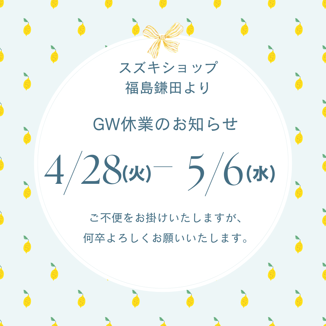 その他 2026.04.24 GW休暇のお知らせ いつも当店をご利用いただきありがとうございます。 誠に勝手ながら 4/28(火)~5/6(水) GW休業とさせていただきます。 5/7(木)から営業再開となりますのでよろしくお願いいたします。
