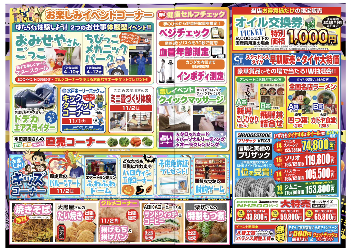 イベント/キャンペーン 2025.10.23 【イベント】第18回ありがとうフェアのお知らせ キャンペーン期間:2025.11.01~2025.11.02 秋のイベントのお知らせです 11月1日(土)、2日(日)開催いたします! ◎ビンゴゲーム大会 ◎トータルライフキャンペーン ◎新車ご成約三大特典 ◎中古車・試乗車・登録済み未使用車大放出 ◎お楽しみイベントコーナー ◎キッズコーナー ◎グルメコーナー ◎オイル交換券限定販売 ◎スタッドレスタイヤ早期販売会&タイヤ大特価 今年も豪華イベントが目白押し ご家族皆様でたくさん楽しんでください ご来場お待ちしております