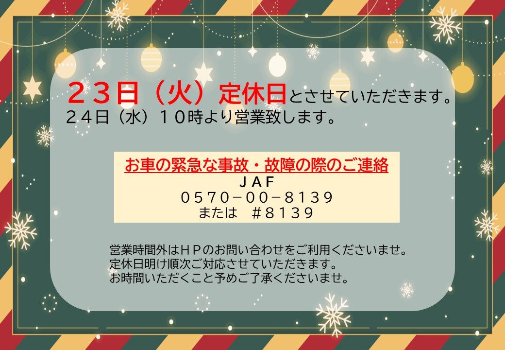 イベント/キャンペーン 2025.12.22 年内営業日も残り僅かです・・・ キャンペーン期間:2026.01.04~2026.01.12 下妻営業所HPを ご覧いただき ありがとうございます ・ ・ ・ 残すとろこ弊社の年内営業も 残り僅かとなりました \新型ワゴンRご試乗できます!/ 冬タイヤへの履き替えや オイル交換など お出かけの準備はお済ですか 26日まで営業しておりますので、 お気軽にお問い合わせくださいませ