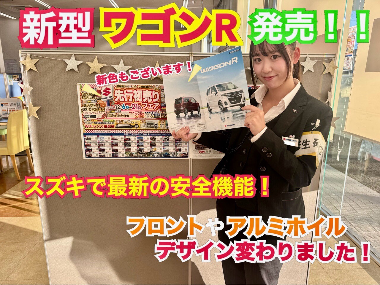 新車情報 2025.12.15 新型ワゴンR発売!!! こんにちは いつも スズキアリーナ牛久店の ホームページをご覧いただき ありがとうございます 週末もたくさんの ご来場ありがとうございました 新型ワゴンR発売しました 新型ワゴンRには デュアルセンサーブレーキサポートⅡ が搭載されたため、 スズキで1番最新の 安全機能に なっております この機能は 衝突の恐れがあると 判断すると 音や メーター表示などで ドライバーに警告 をします また、ブレーキペダルを踏むと ブレーキ踏力をアシスト そして 衝突の可能性が高まると 自動で強いブレーキをかけ 衝突の回避 または 衝突時の被害軽減 を図ります なので 安心してお車に お乗りいただくことが できます デザインとしては、 フロントグリルや アルミホイールが マイナーチェンジ前と 変わっています また ベルベットダークレッドパール という新色が出ました! 新型クロスビーやスペーシア にも付いている ハンドルが温まる ステアリングヒーターも 新型ワゴンRには ついております このようなたくさんの 機能が付いた 新型ワゴンR いかがでしょうか 皆様のご来店 お待ちしております また初売り先行フェアが今週末で終了致します 今年中にお車のご検討をされているお客様は 是非このお得な展示会にいらして下さい 定休日のお知らせ 12月16日(火)17日(水)は 定休日とさせていただきます。 よろしくお願いいたします。 お車の故障でお困りの場合は JAF 0570-00-8139 または#8139までご相談ください。