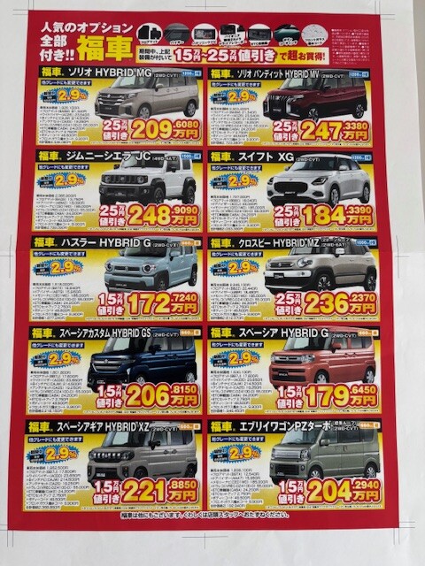 イベント/キャンペーン 2025.10.06 ハロウィーンイベント始まりました キャンペーン期間:2025.10.01~2025.10.30 店内にハロウィーンの装飾をしました 商談プレゼントにもハロウィーンのお菓子が追加されました 来場の際はトリックオアトリート!とけをかけてくださいね 当社独自のワンプライスも用意しております この他にも全方位モニターナビ付のワンプライス車も用意しております クロスビーの展示車もございますのでぜひ見に来てください 10/31よりイベントを予定しております。詳細は今しばらくお待ちください