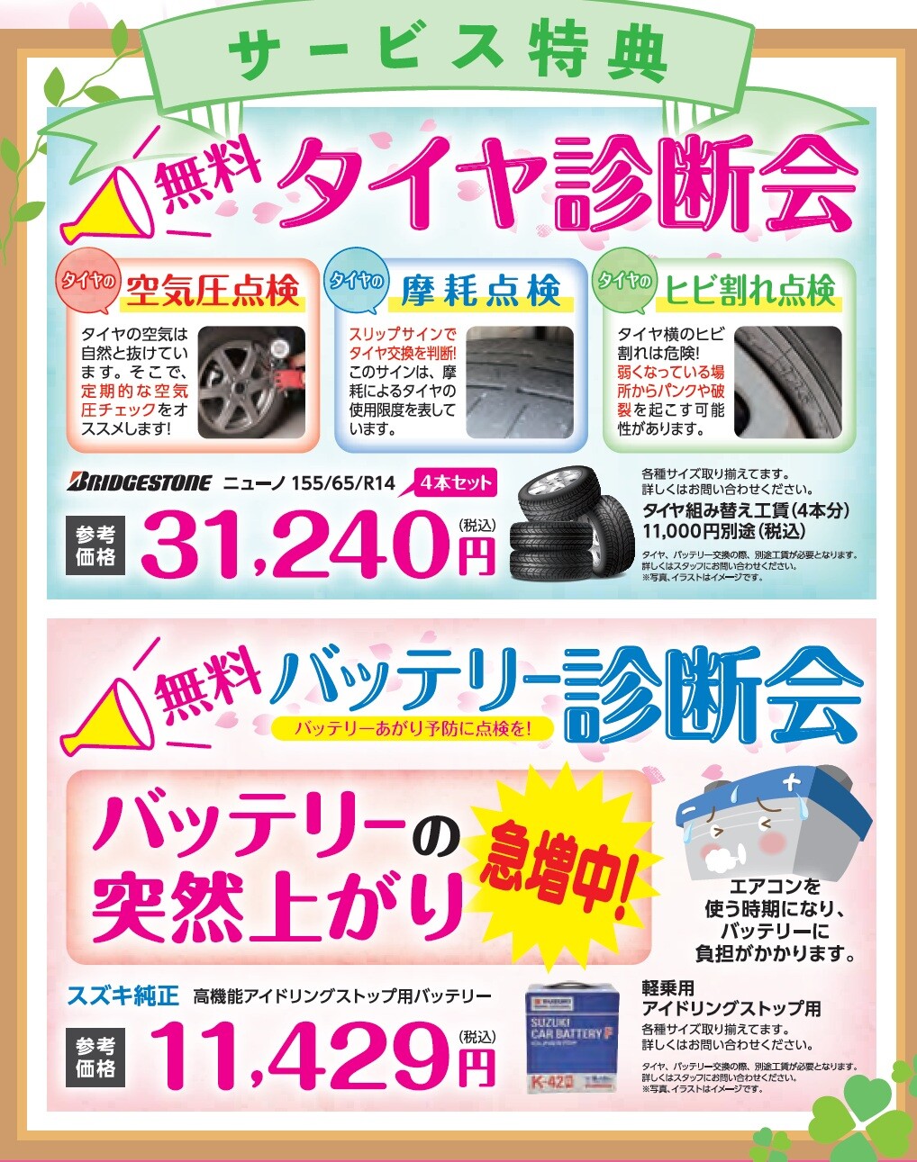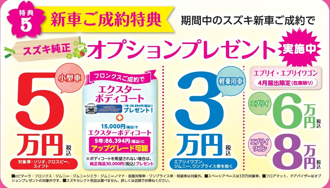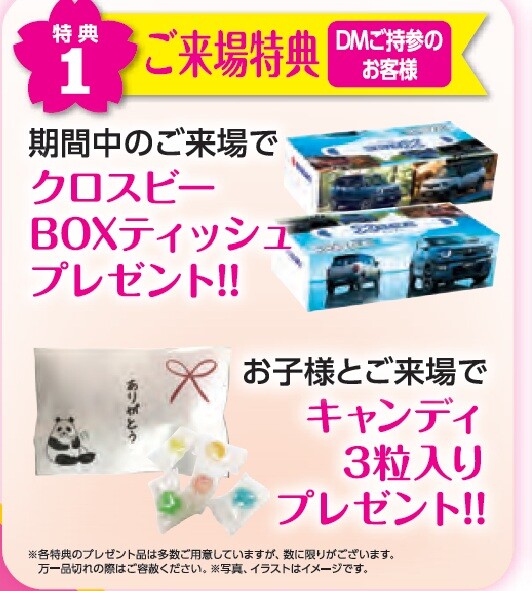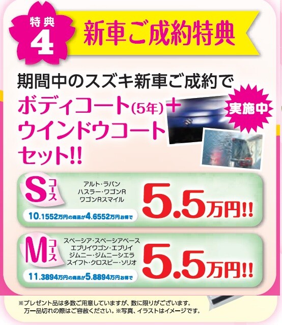 イベント/キャンペーン 2026.04.06 春の大感謝祭! キャンペーン期間:2026.04.11~2026.04.30 いつもスズキアリーナ佐野のブログをご覧いただき ありがとうございます。 最近は暖かくなり過ごしやすい季節が続いていますね 通勤途中の道から見える桜が満開でした お花見の季節到来 ということで、、、、、 開催します! 春の大感謝祭 ご来場特典 ご商談特典 お車ご成約で オプションプレゼント ボディコート(5年)+ウィンドウコート 診断会も開催します 車のメンテナンスいかがですか ご来店お待ちしております