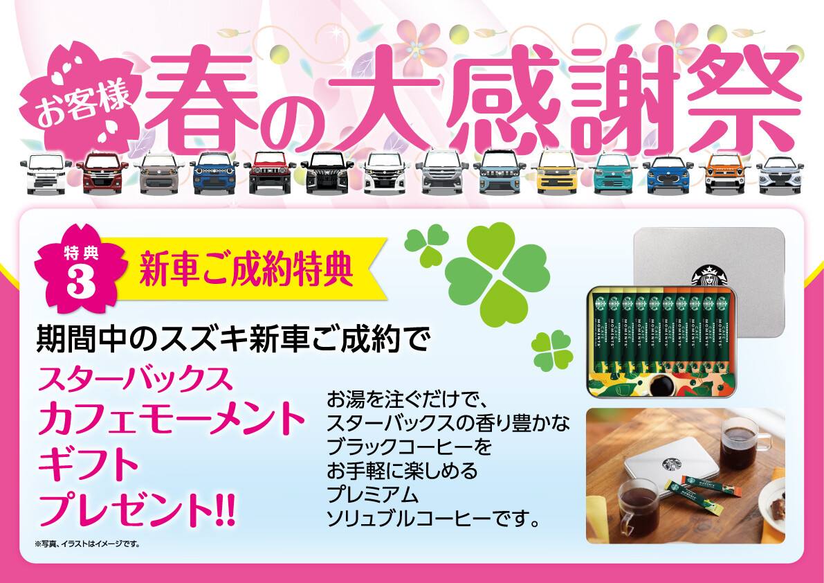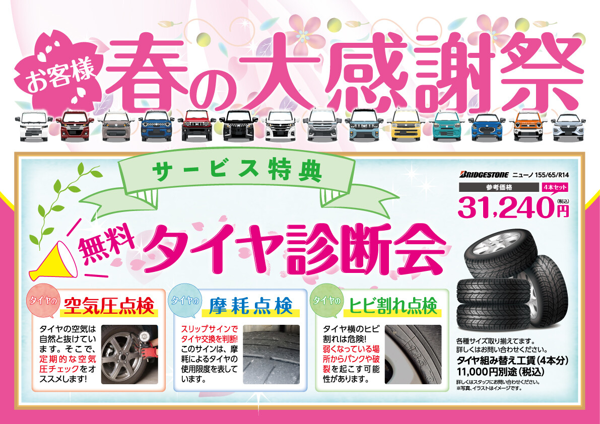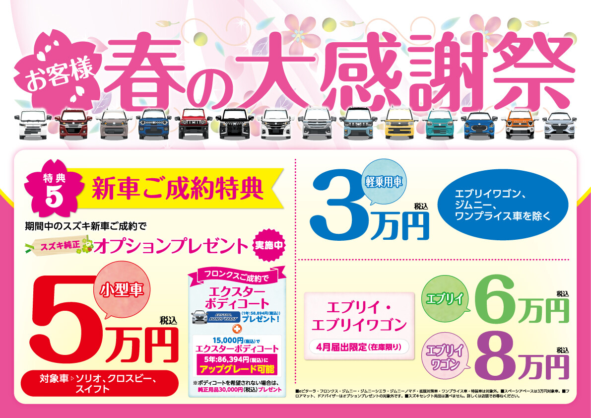 イベント/キャンペーン 2026.04.27 春の大感謝祭開催中です 春の大感謝祭 いつもスズキアリーナ佐野の ブログをご覧いただきありがとうございます 春の大感謝祭もいよいよ残すところあと2日!! スズキの愛車にお乗りのお客様 連休前に車のメンテナンスはいかがでしょうか 4月30日まで開催中です!! 皆様のご来店をスタッフ一同 お待ちしております