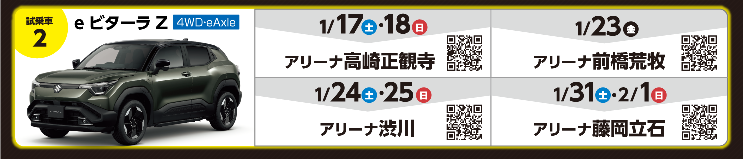 試乗車1の「eビターラX」の日程がご案内できない状況でございます。