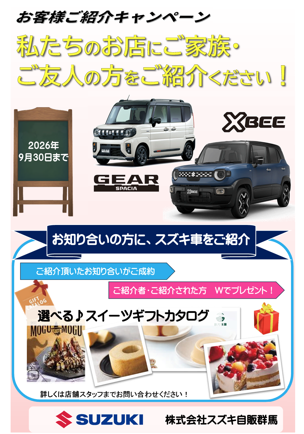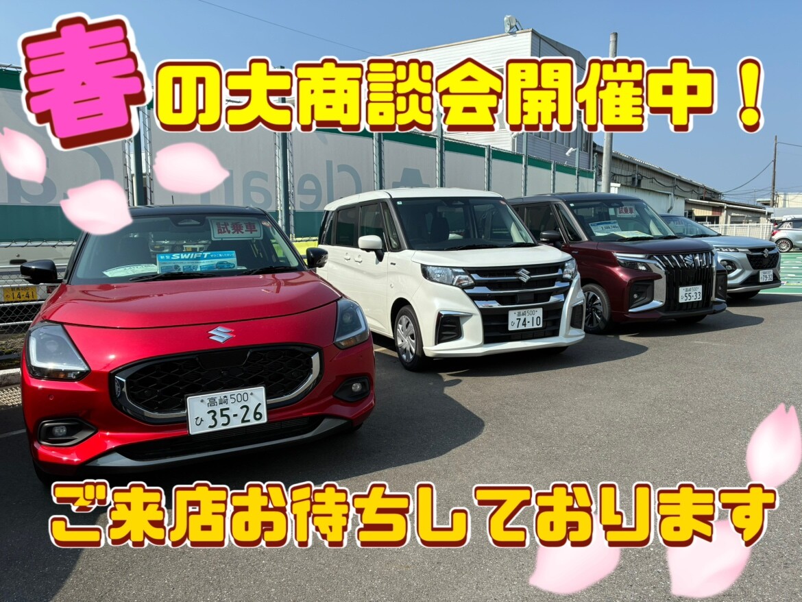 イベント/キャンペーン 2026.03.29 春の商談会開催中☆彡 みなさまこんにちは 早くも3月が終わり、 新年度の4月になりましたね 『春の大商談開催中』 乗っているクルマの車検がもうすぐ切れてしまう方 最近クルマの調子が悪いな 通勤・通学にクルマが必要 そんな方におススメのお車がございます 『お客様ご紹介キャンペーン』 おクルマご検討されているご家族・ご友人の方をご紹介ください♪ ご紹介者の方・ご紹介頂いた方 双方にグルメギフトをプレゼントします WEB予約はこちらから お電話からも受付中!
